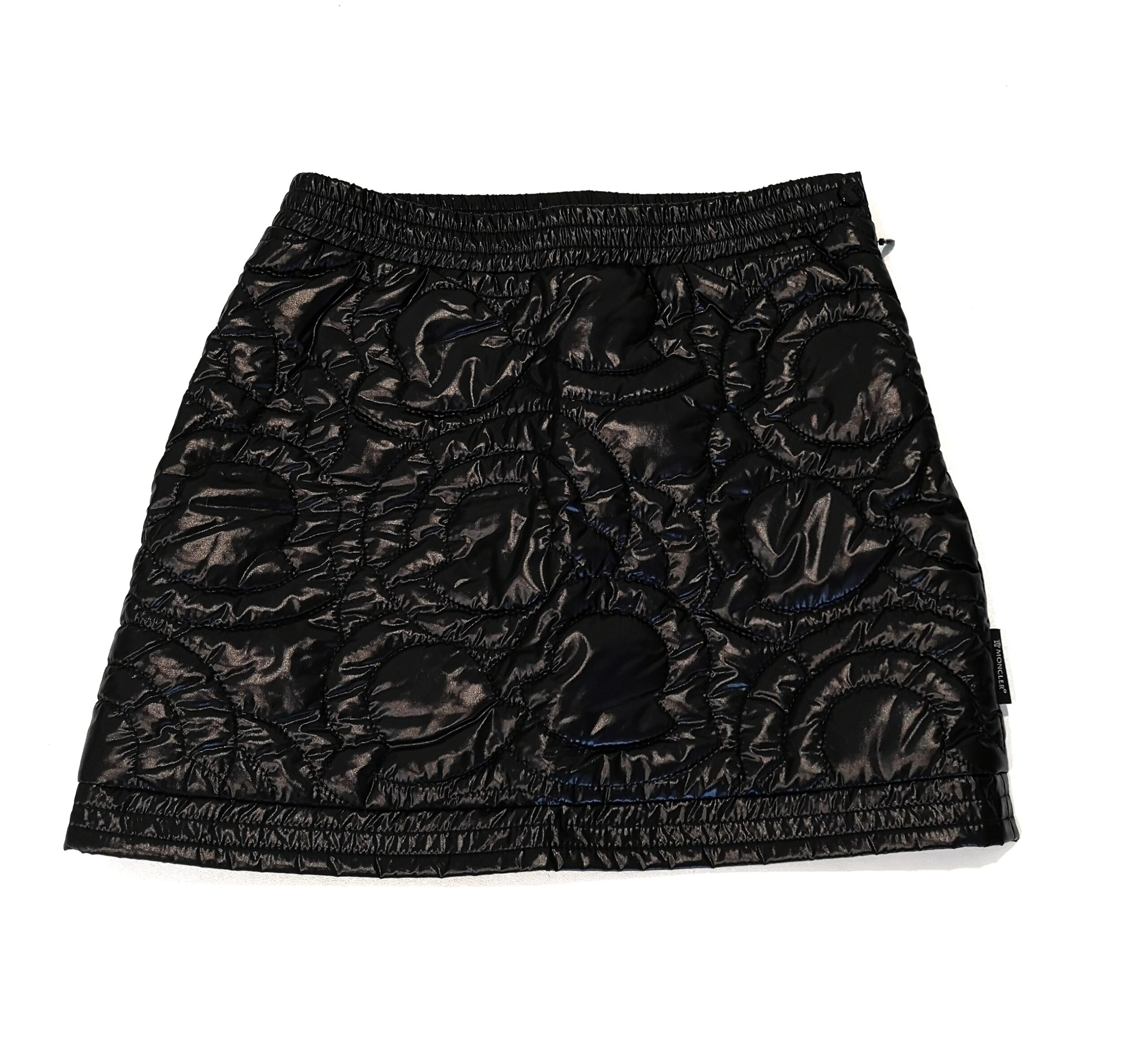 Gonna nera in nylon trapuntata. Fascia elastico nel bordo inferiore e in vita. Chiusura con zip laterale