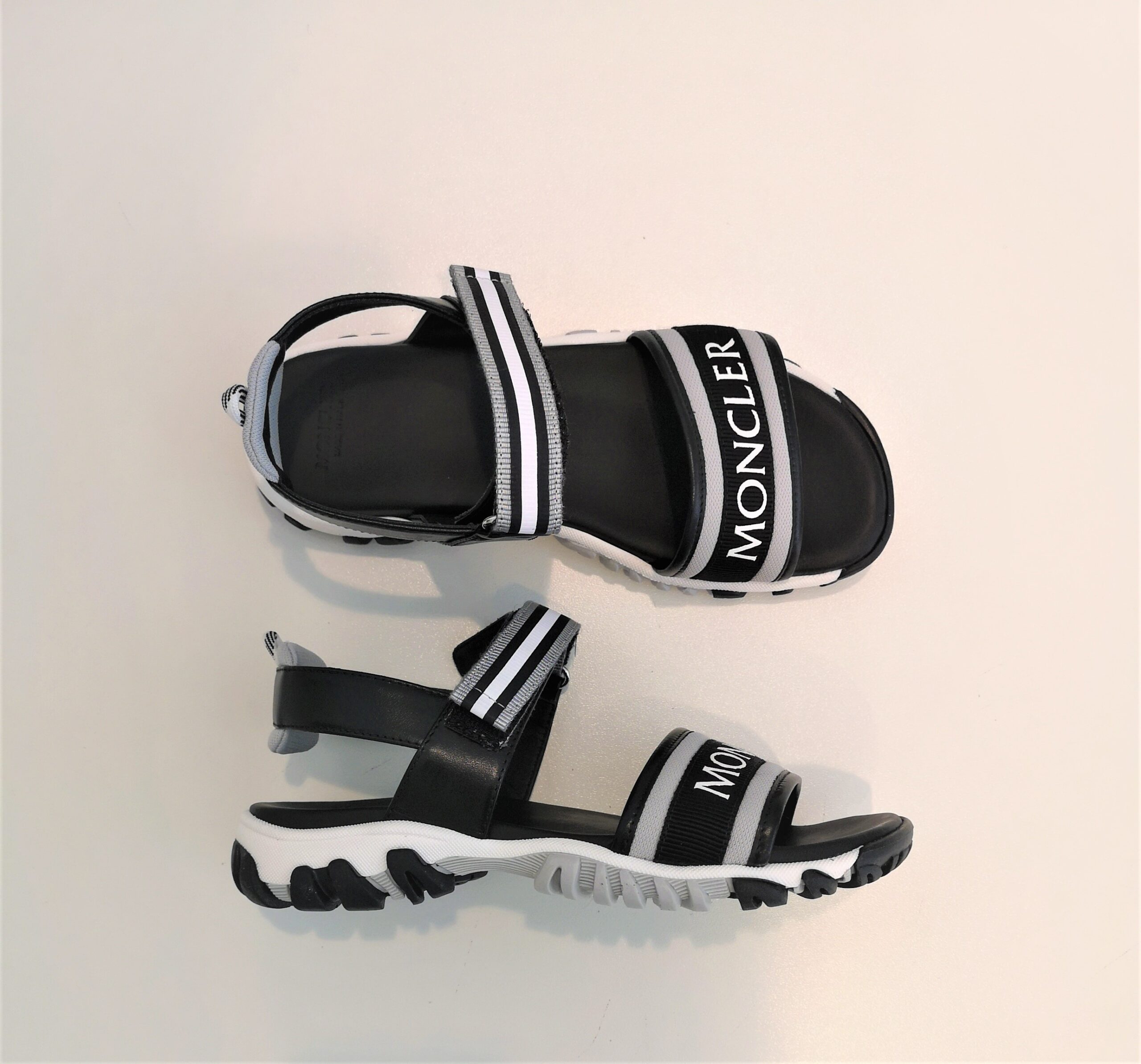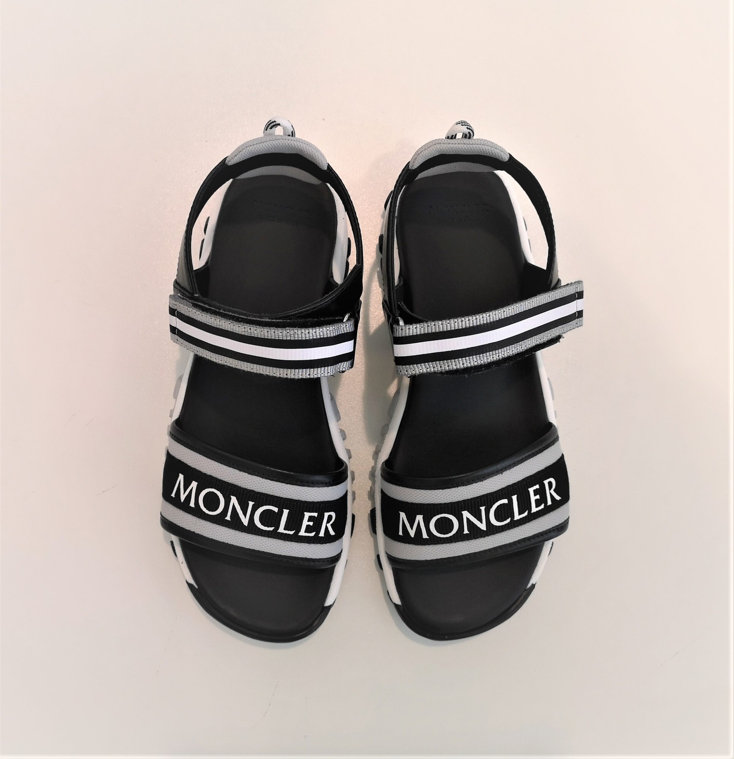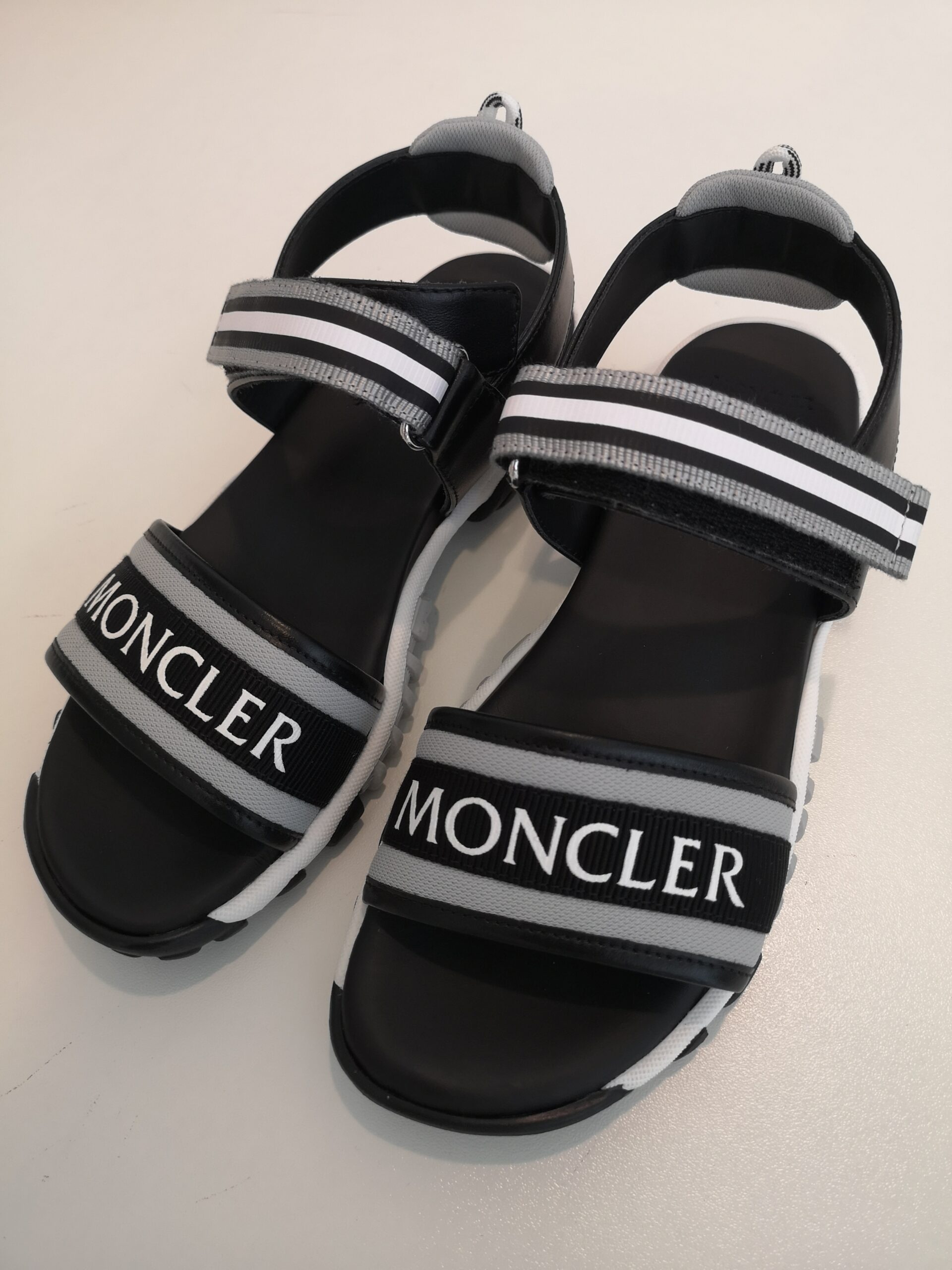 Sandali grigio-nero con velcro. Logati sopra con scritta MONCLER