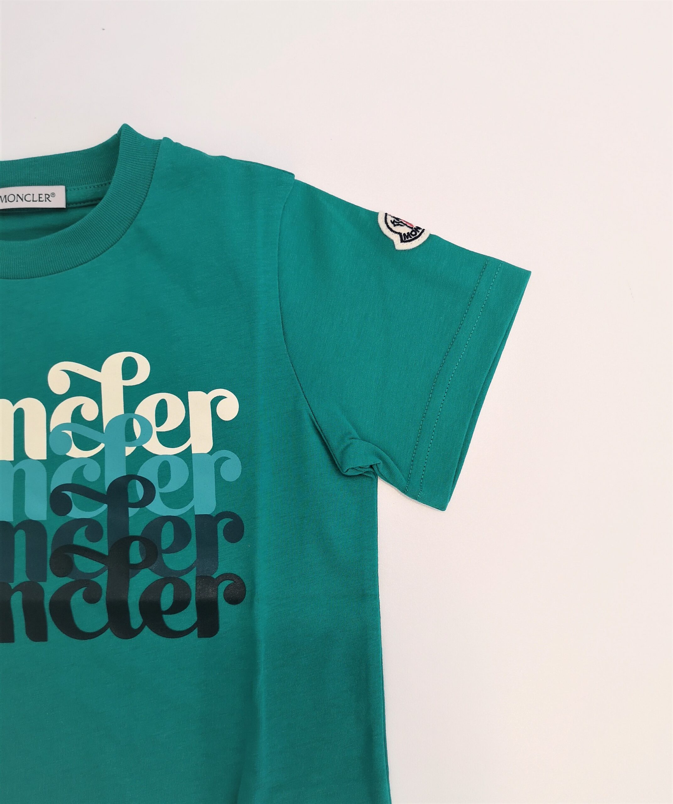 T-shirt manica corta girocollo verde con scritte Moncler in gradazione di colore. Logo in feltro sulla manica.