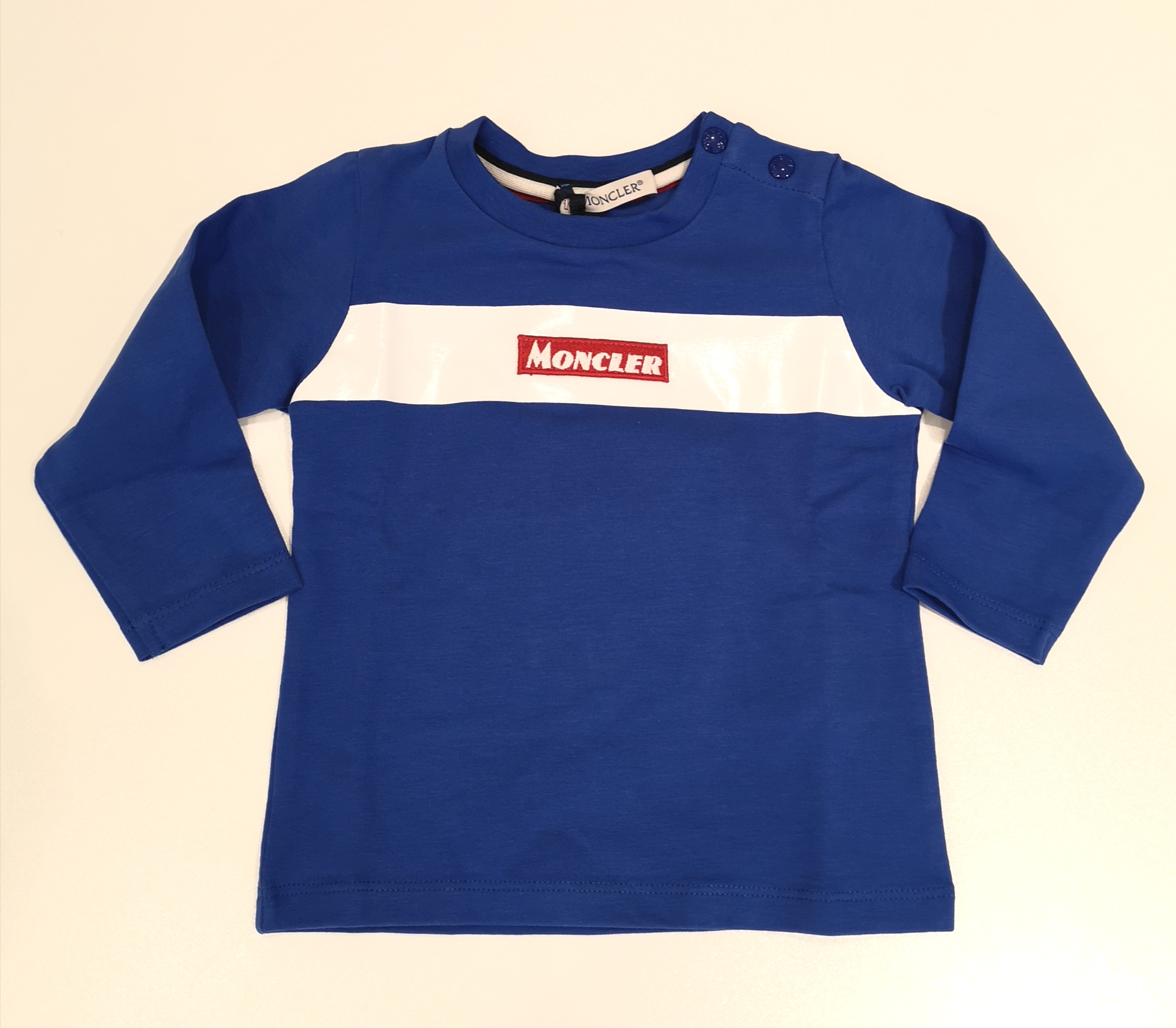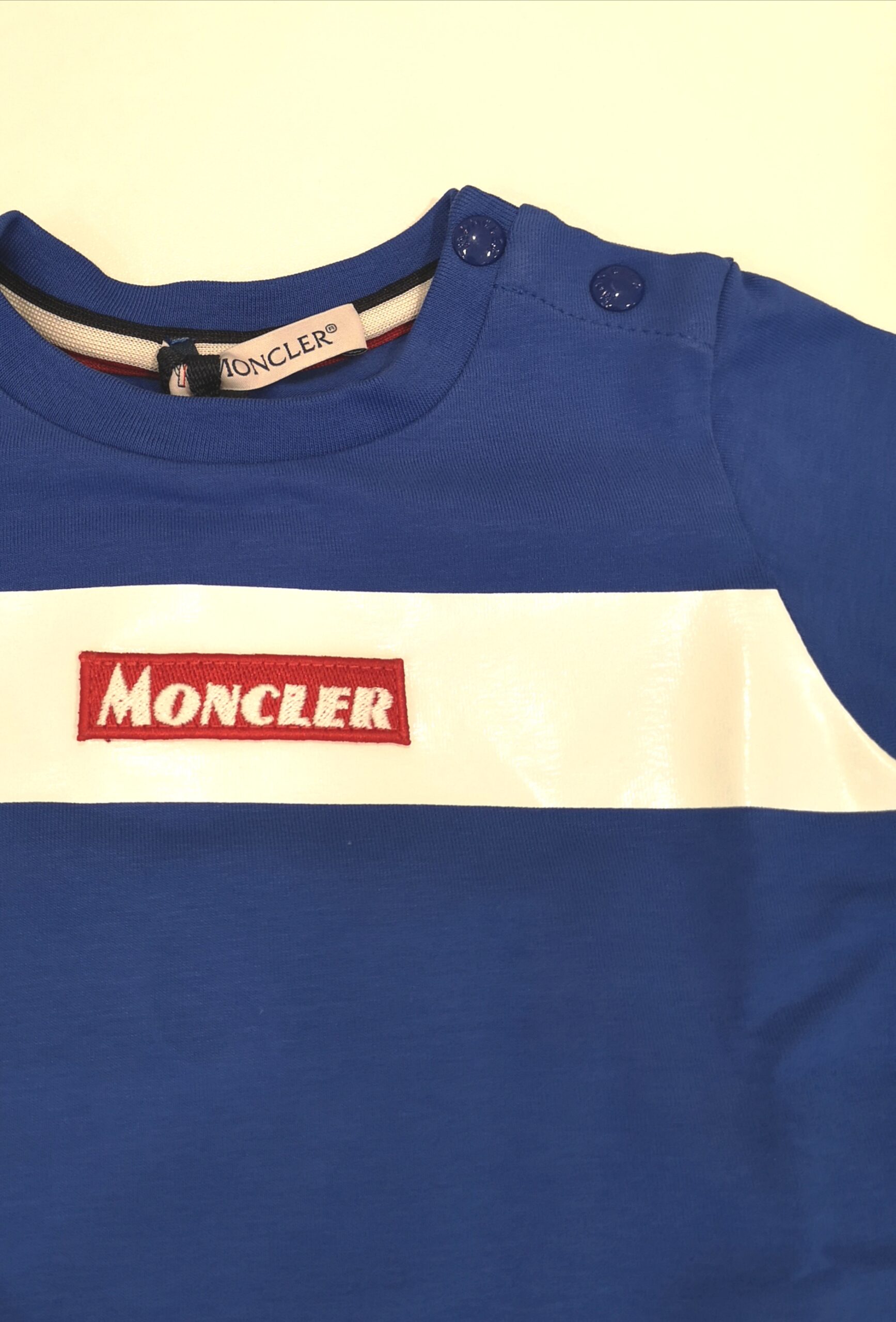 T-shirt girocollo bluette con fascia centrale bianca e scritta Moncler in rosso e bianco