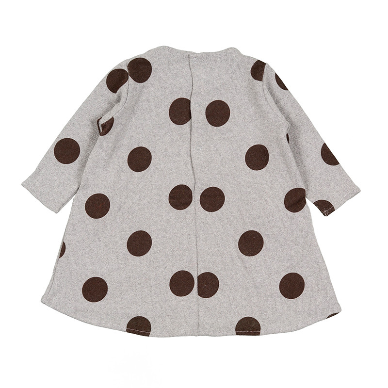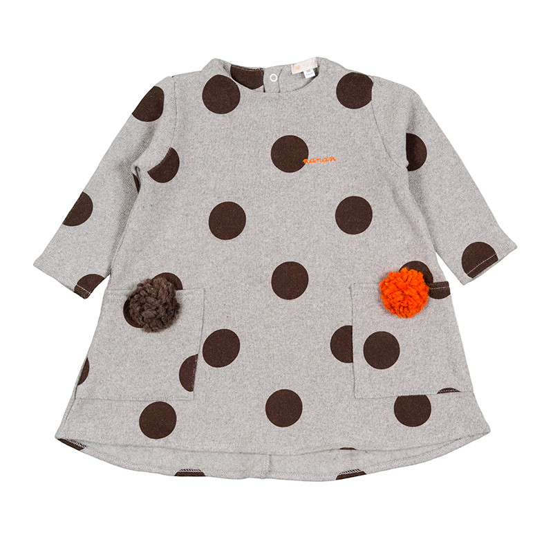 Delizioso abito grigio a pois marroni della collezione “Pon Pon”, impreziosito da taschine frontali con pon pon applicati. Abbottonatura posteriore.
