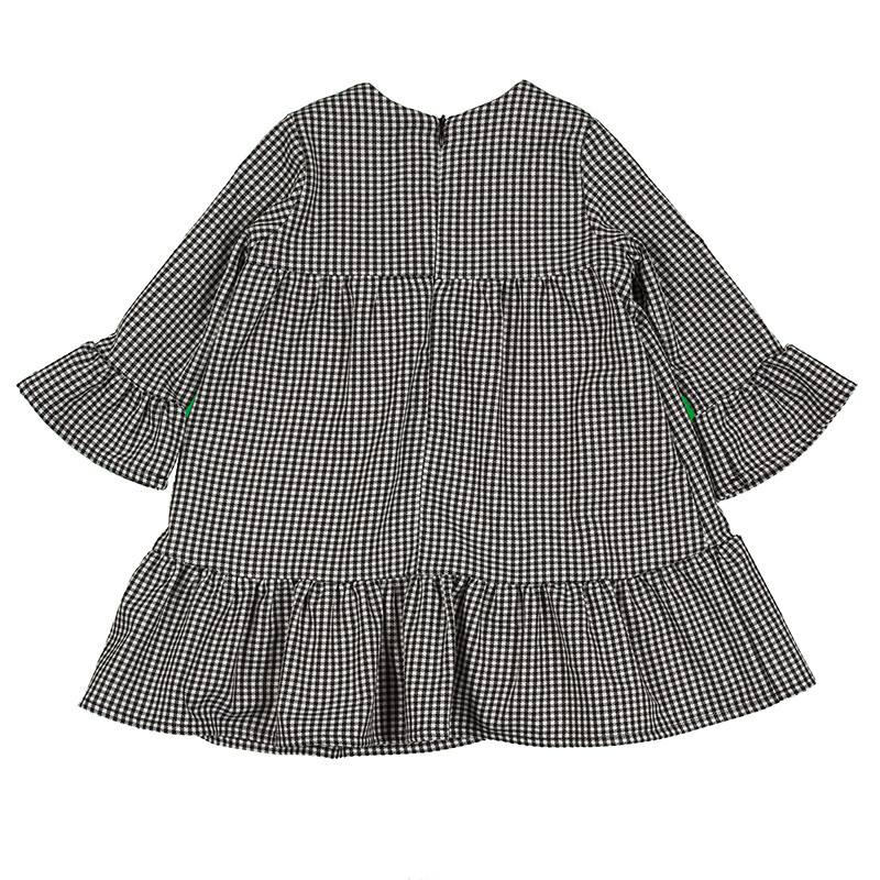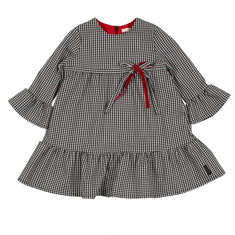 Grazioso abito in pied de poule nero della collezione “Stella”, impreziosito da una dolce balza sul fondo dell’abito e sul fondo delle maniche e da un dolce fiocco applicato sul fronte con dettaglio rosso. Chiusura posteriore con zip.