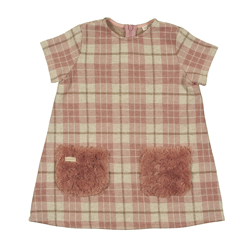 Grazioso abito in check rosa della collezione “Pippi”, impreziosito da due dolci taschine in eco-pelliccia rosa applicate sul fronte. Chiusura con zip automatica posteriore.