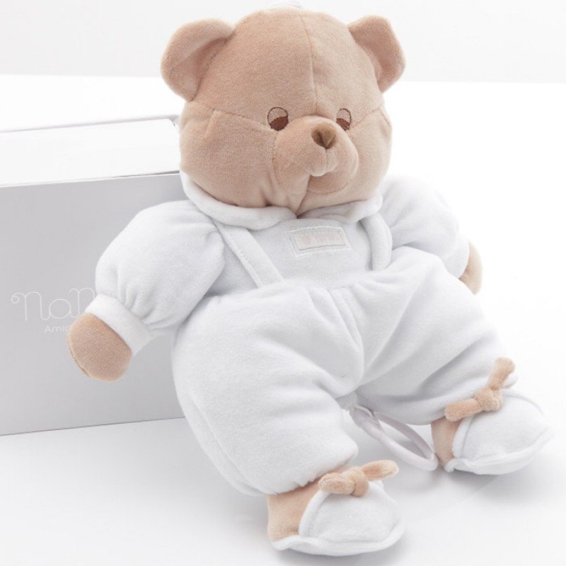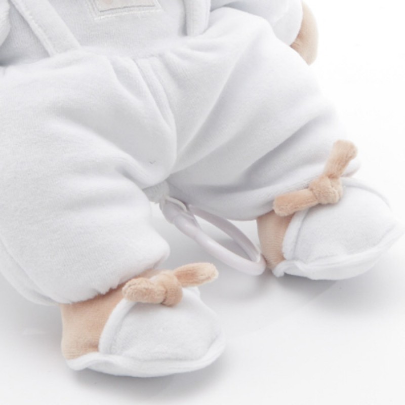 Il carillon della linea Puccio è un peluche di morbida ciniglia vestito in tessuto piquet.