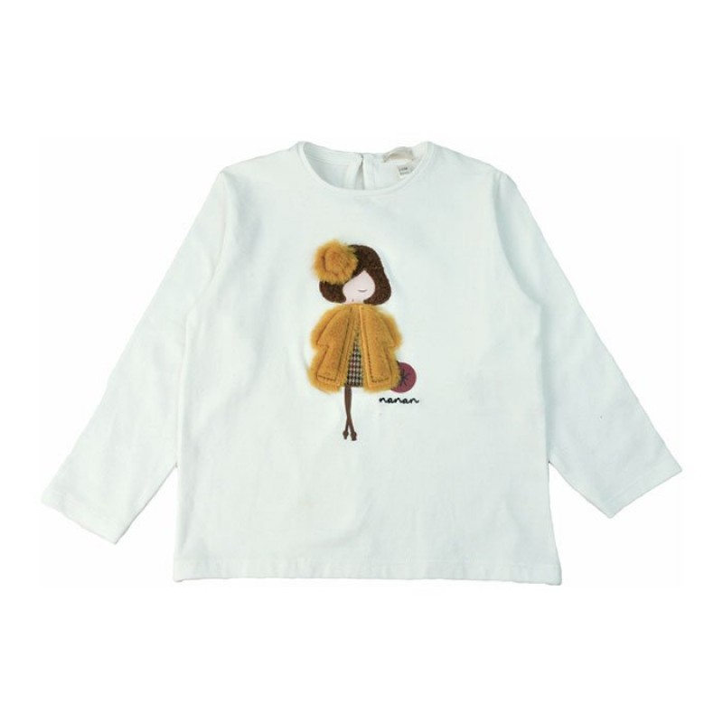 Graziosa t-shirt bianca realizzata in 100 % cotone, con dolce bambolina applicata al centro con dettagli in eco pelliccia senape e ricamo Nanan. Composizione: 100% Cotone