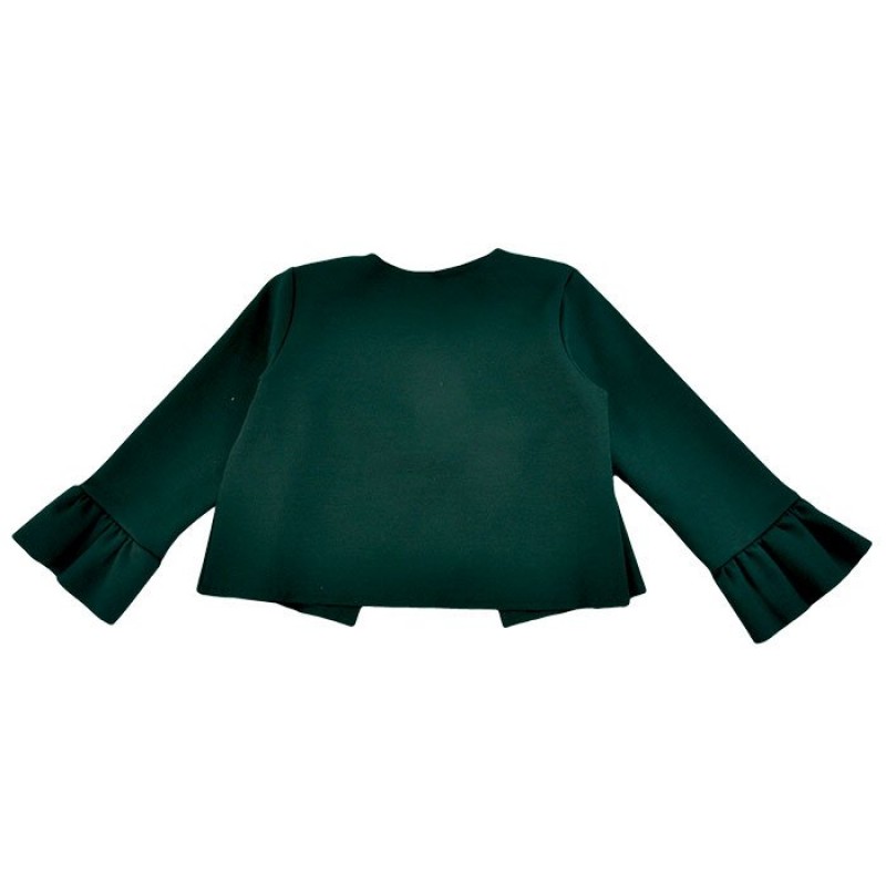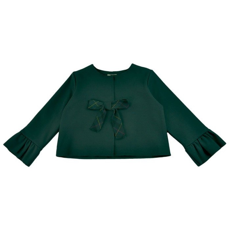 Morbido cardigan verde con fiocco check verde sul fronte e ruche sulle maniche. Composizione: 70% Poliestere 26% Rayon 4% Elastan
