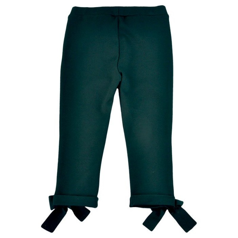 Grazioso pantalone verde in punto milano con fiocchi alle caviglie, impreziosito dalle bande in velluto laterale e da una targhetta Nanan. Composizione: 70% Poliestere 26% Rayon 4% Elastan