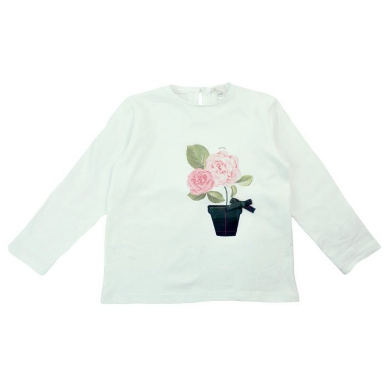 Morbida t-shirt bianca realizzata in cotone con stampa di un vaso di fiori sul fronte e fiocchetto. Composizione: 100% Cotone
