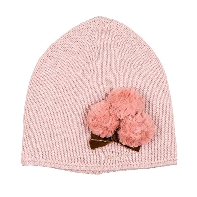 Graziosa berretta in tricot rosa della collezione “Pippi”, impreziosita da dolci pon pon in eco-pelliccia e tenero fiocchetto in velluto marrone applicati.