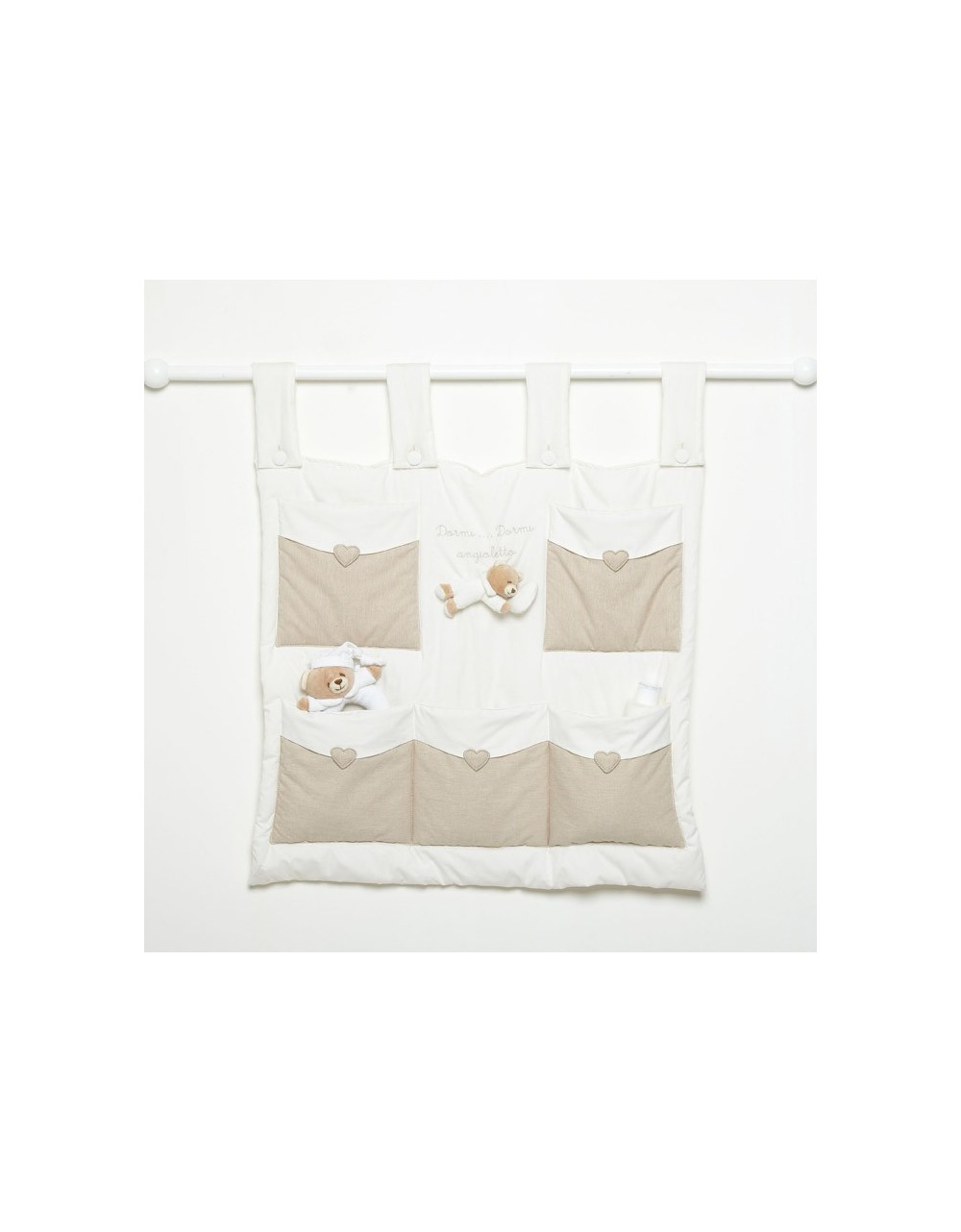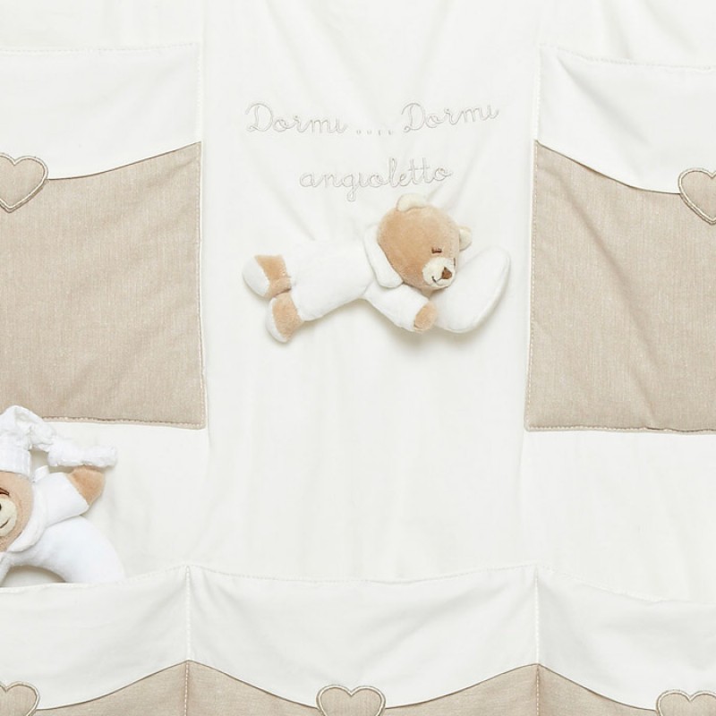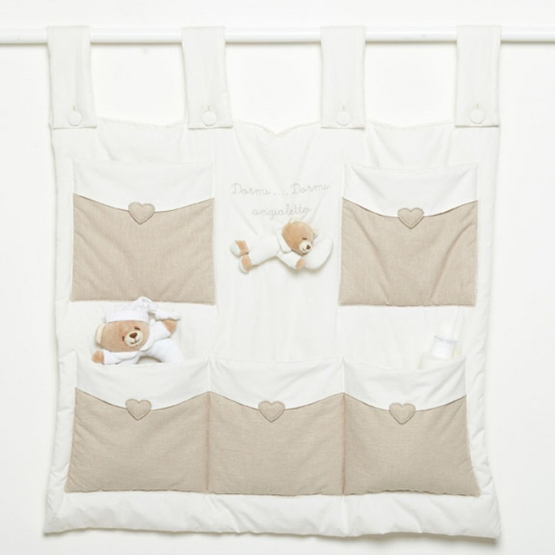 Il pannello della collezione Tato è un comodissimo portaoggetti con ricamate cinque comode tasche, in cui introdurre tutto il necessario per la nanna e la quotidianeità del tuo bebè.
