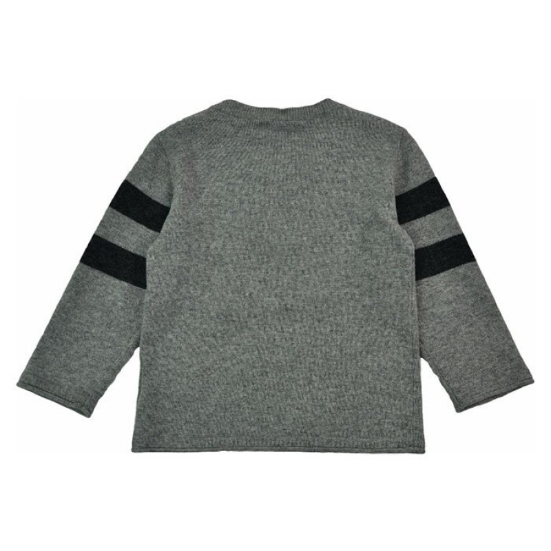 Morbido maglioncino grigio realizzato in tricot, impreziosito da un simpatico orsetto sul fronte e bande sulle maniche.
