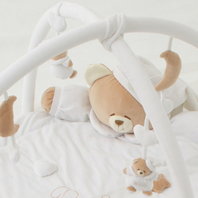 La palestrina è un luogo magico, di gioco e di apprendimento. Un morbido tappeto di ciniglia, leggermente imbottito con fibra di ovatta, da cui spuntano la testa ed i piedi del tenero orso. Stelline sonore, cuoricini, lune e orsetti appesi stimolano le prime percezioni e la fantasia del bebè. Gli amici d’infanzia ti accompagnano e seguono il piccolo durante i primi passi e le prime fantasie !
