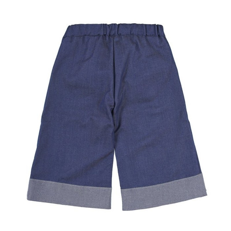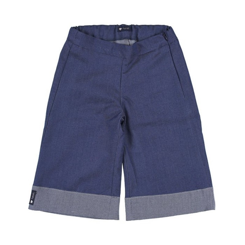 Delizioso gaucho in blu jeans della collezione “Fragolina”, impreziosito da risvolto sul fondo. Zip laterale.