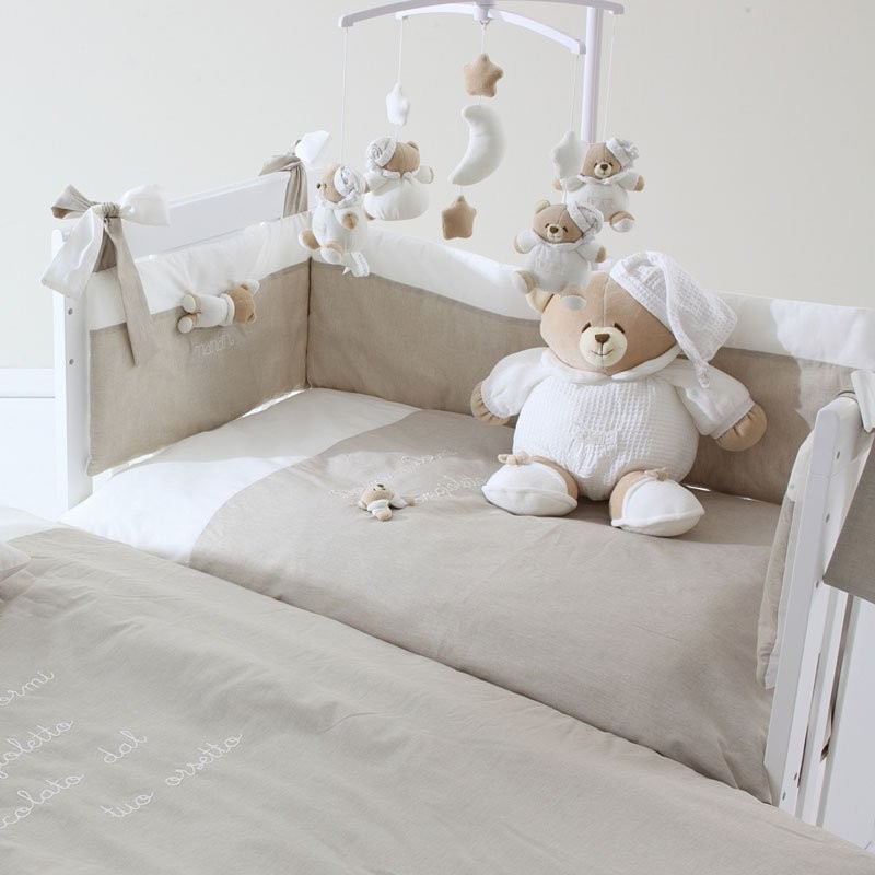 Impreziosito dal ricamo centrale “dormi dormi angioletto coccolato dal tuo orsetto”, e dal personaggio in peluches Tato, riveste un lettino giocoso e romantico, per far sentire protetto il bebè durante la nanna assieme al suo piccolo amico Tato.
