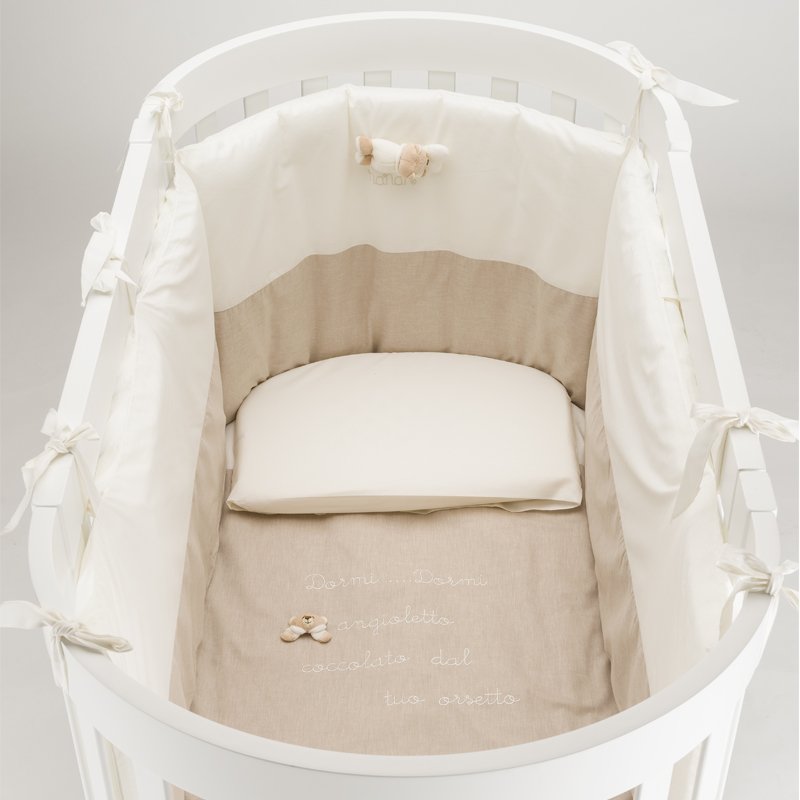 Il set piumone Nanàn della Collezione Ovale è formato da: federa per cuscino, paracolpi imbottito, piumone sfoderabile e quindi facile al lavaggio, con una composizione di puro cotone.