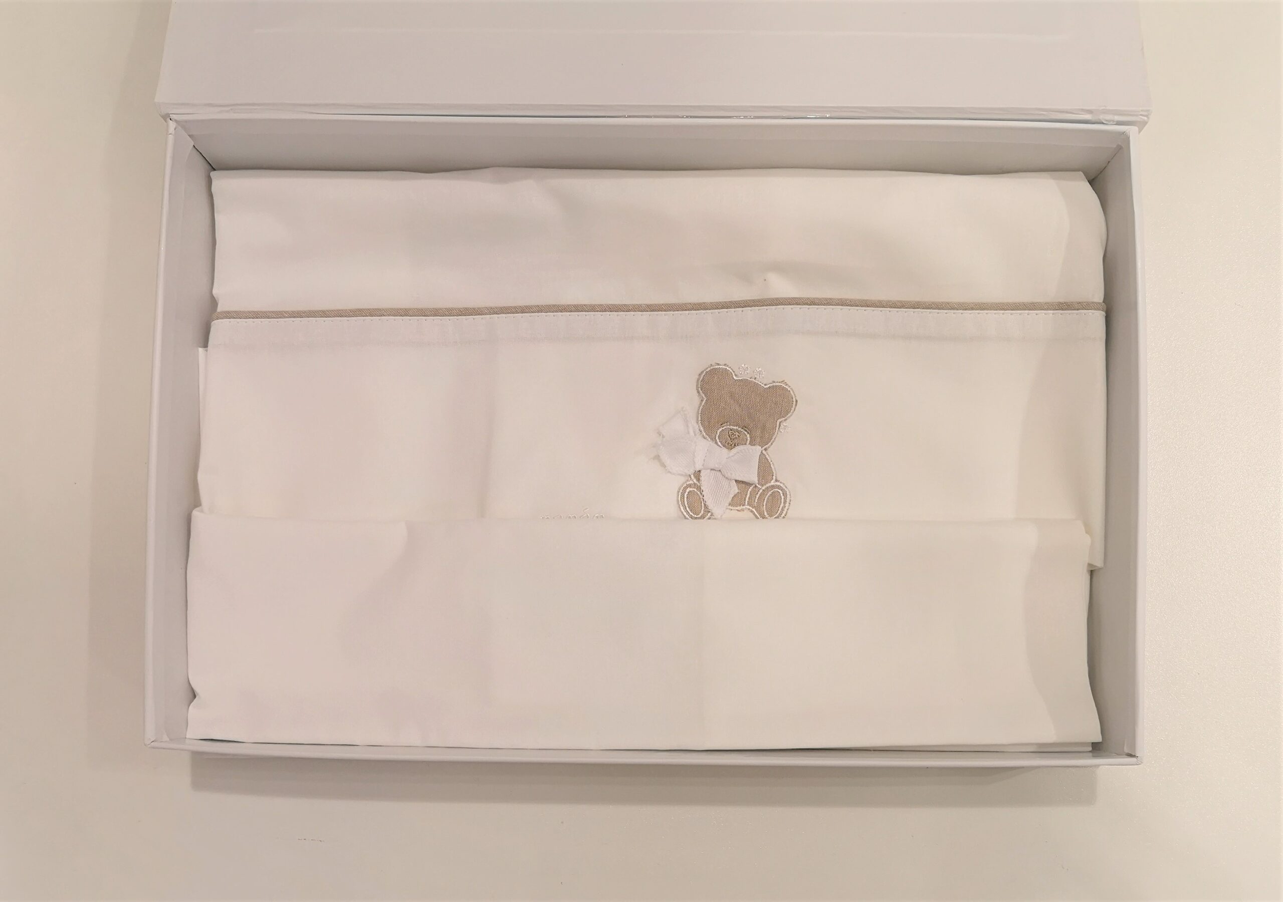 Il set lenzuola carrozzina Nanàn è formato da: federa per cuscino, lenzuolino e coprimaterasso. Il lenzuolino è impreziosito dall’applicazione del piccolo orsetto color tortora.