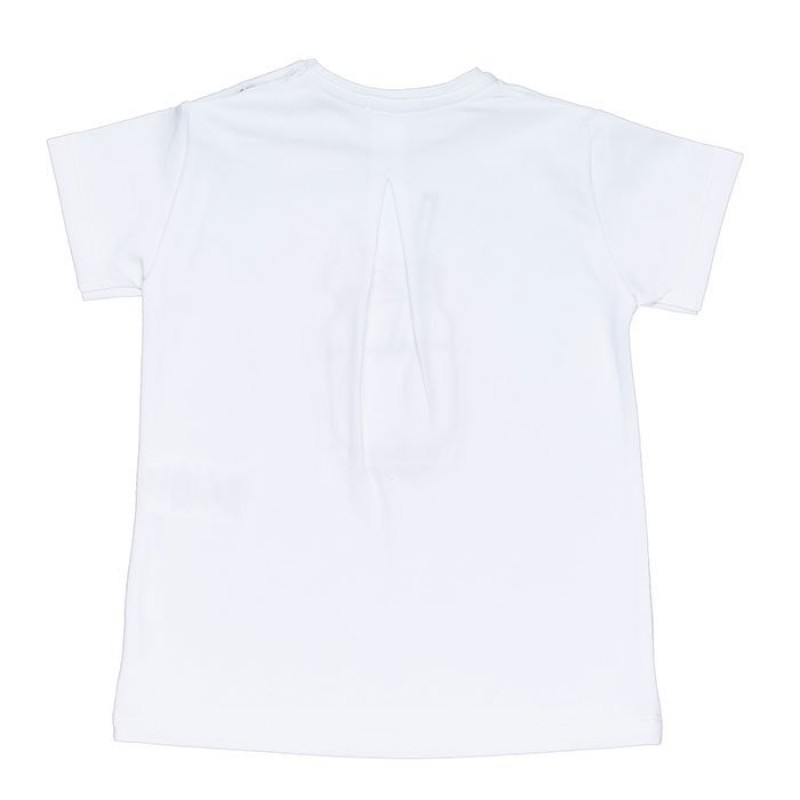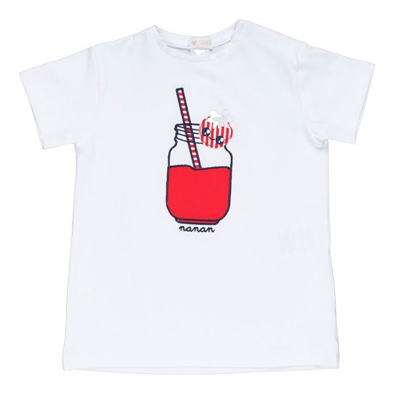 Graziosa t-shirt bianca della collezione “Fragolina”, impreziosita da bicchiere con cannuccia e tenera fragolina ricamata sul fronte.