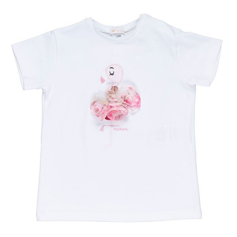 Deliziosa t-shirt bianca della collezione “Confetto”, impreziosita da un fenicottero rosa ricamato e rose a fantasia floreale applicate.