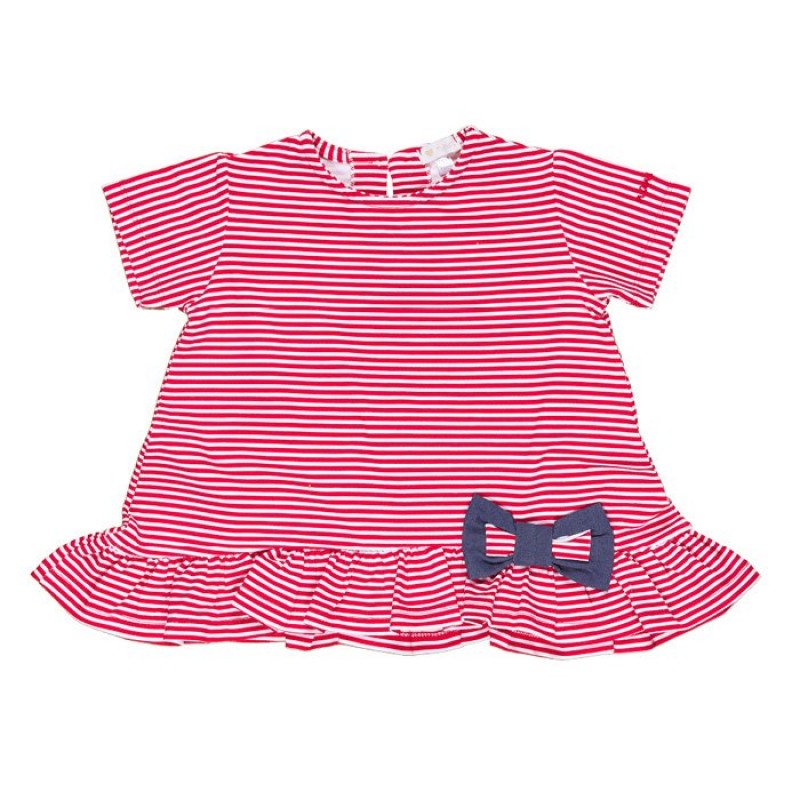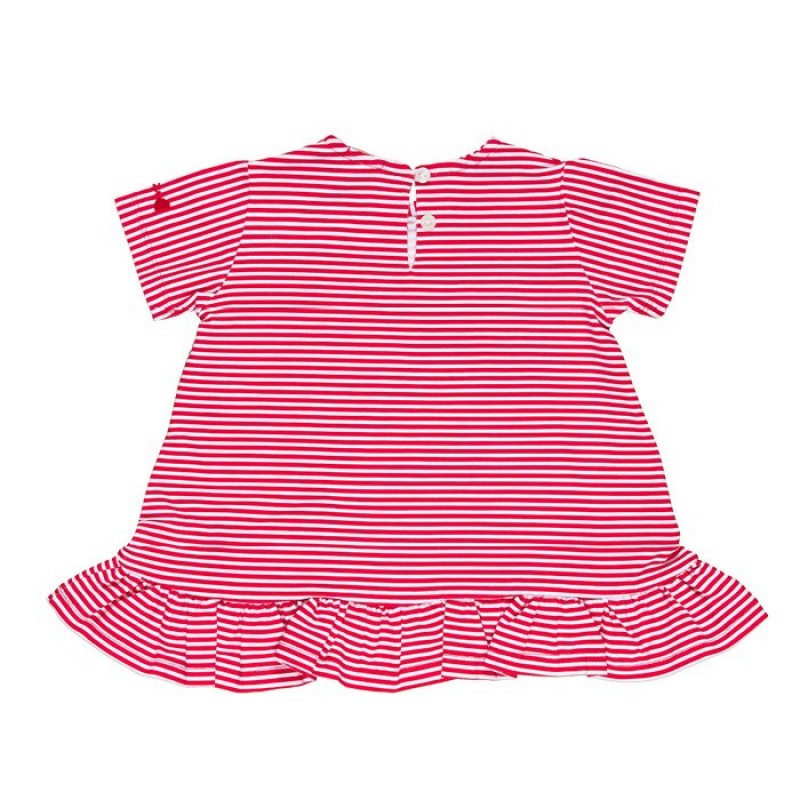 Graziosa maxi t-shirt della collezione “Fragolina” a righe bianche e rosse, impreziosita da balza sul fondo e fiocco applicato.