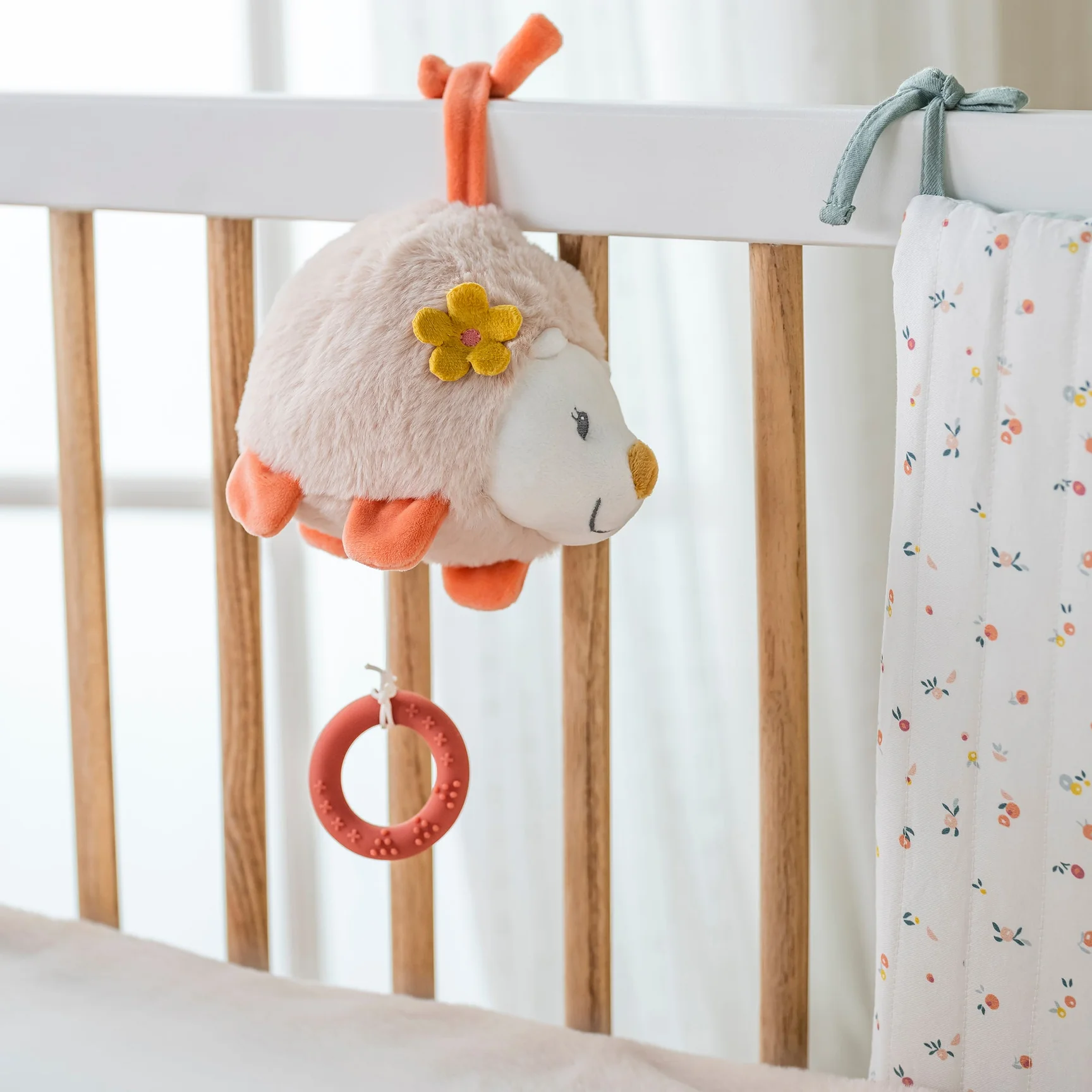 Il simpatico peluche Zoë, con la sua bella pelliccia, conquista i cuori dei neonati di tutto il mondo. L’adorabile riccio offre innumerevoli possibilità di presa – tra cui le orecchie, le zampe o il resistente anello in silicone – e favorisce così lo sviluppo del senso del tatto e delle capacità motorie. Il carillon integrato fornisce anche la necessaria rassicurazione al bambino nei momenti di tristezza con le sue dolci melodie. Grazie alle due cinghie sul retro, il peluche può essere facilmente legato al lettino o alla carrozzina.