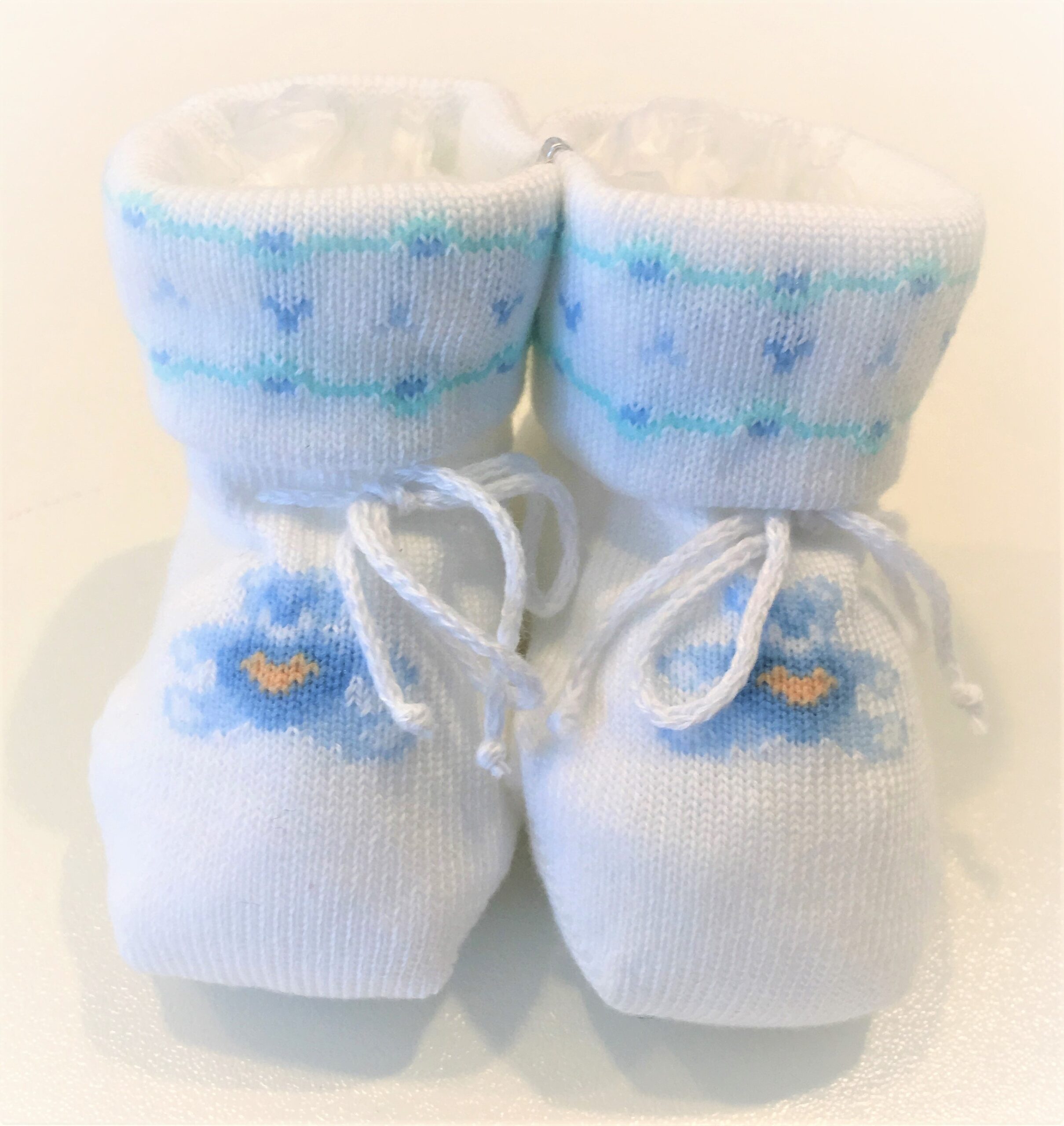 Scarpina in caldo cotone PAOLO ROMBOLI, colore bianco con orso azzurro e cuoricino giallo.