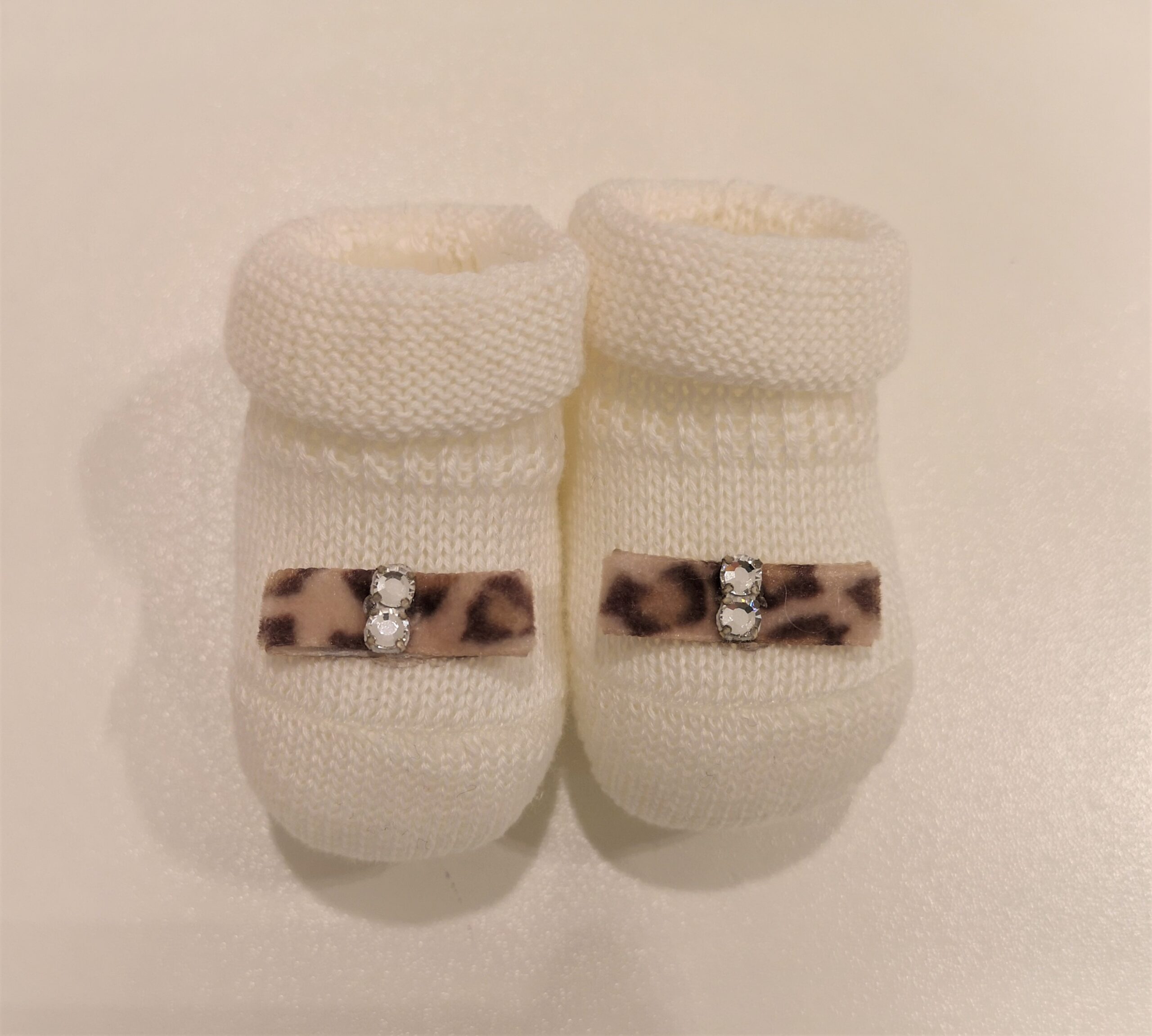 Scarpina in maglia PAOLO ROMBOLI, colore panna con fiocchino maculato e strass sopra