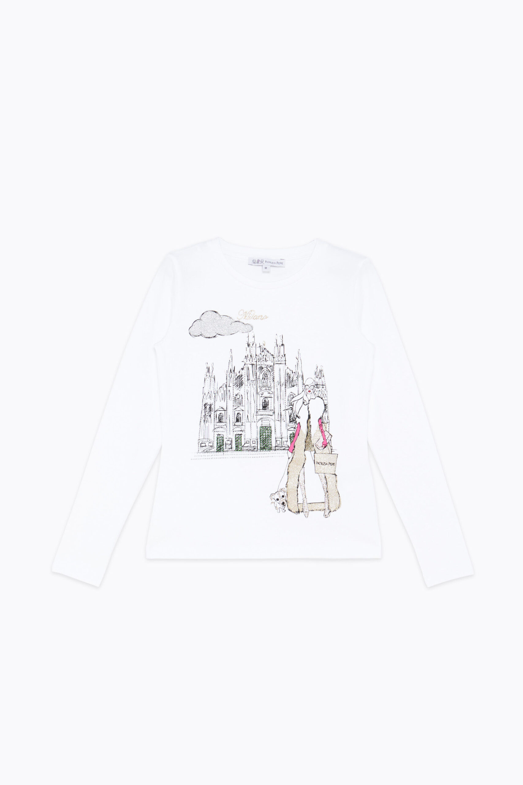 T-shirt girocollo manica lunga bianca. Stampa Milano con glitter e piccole applicazioni