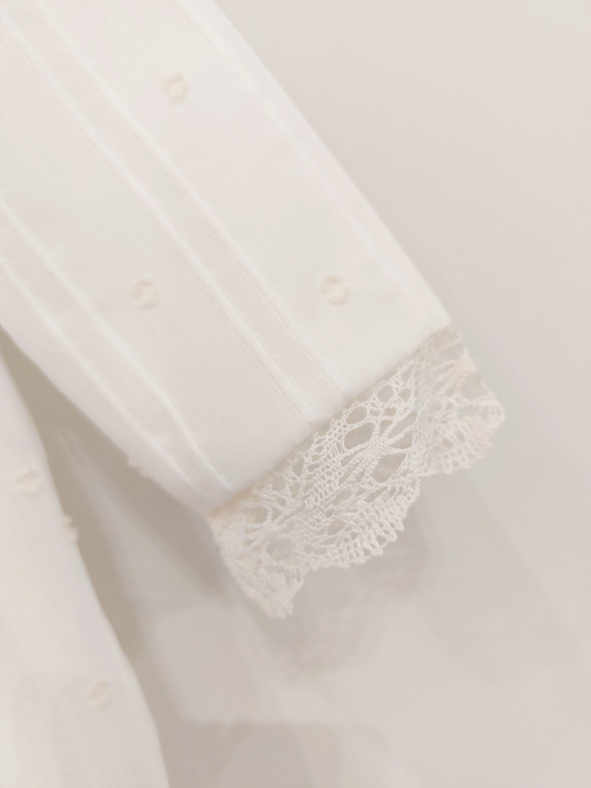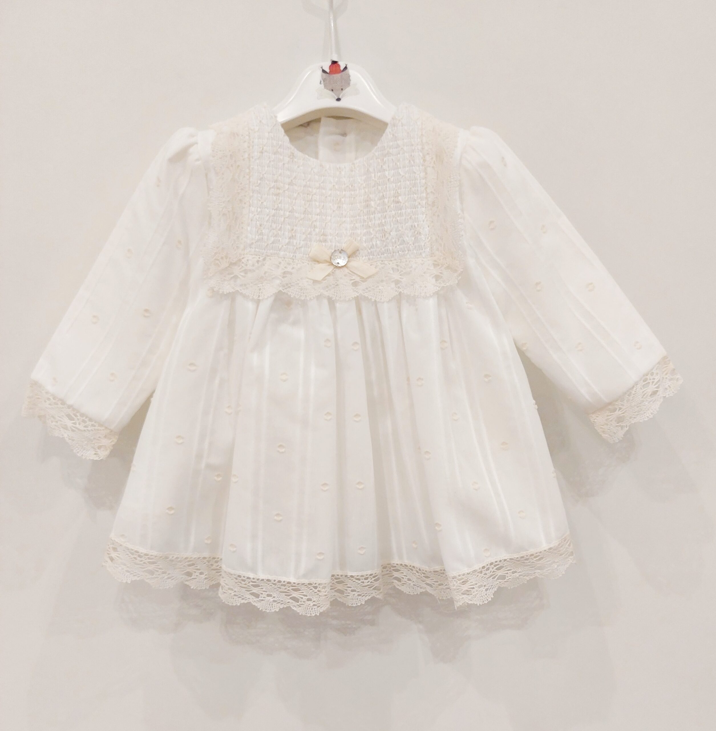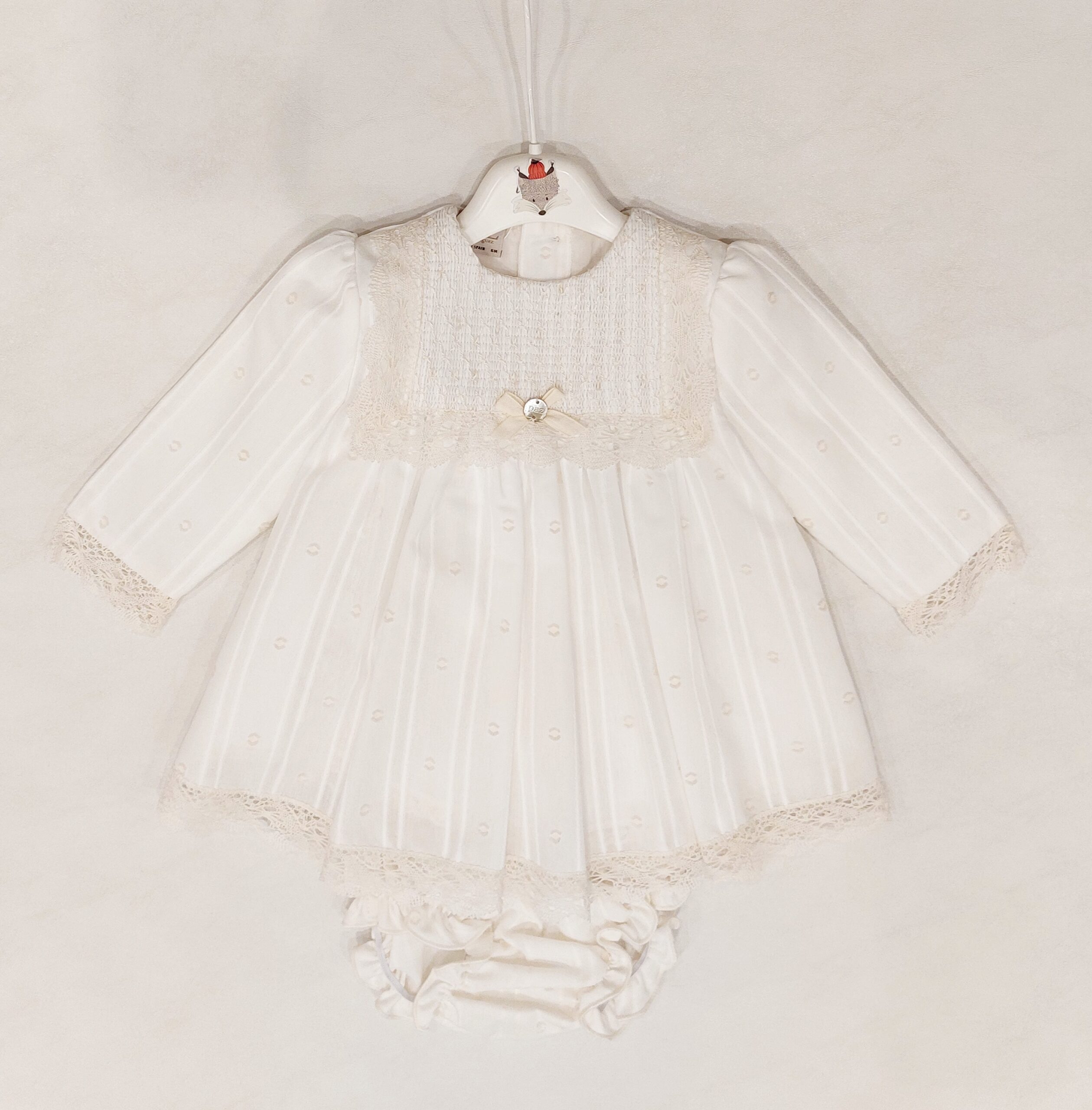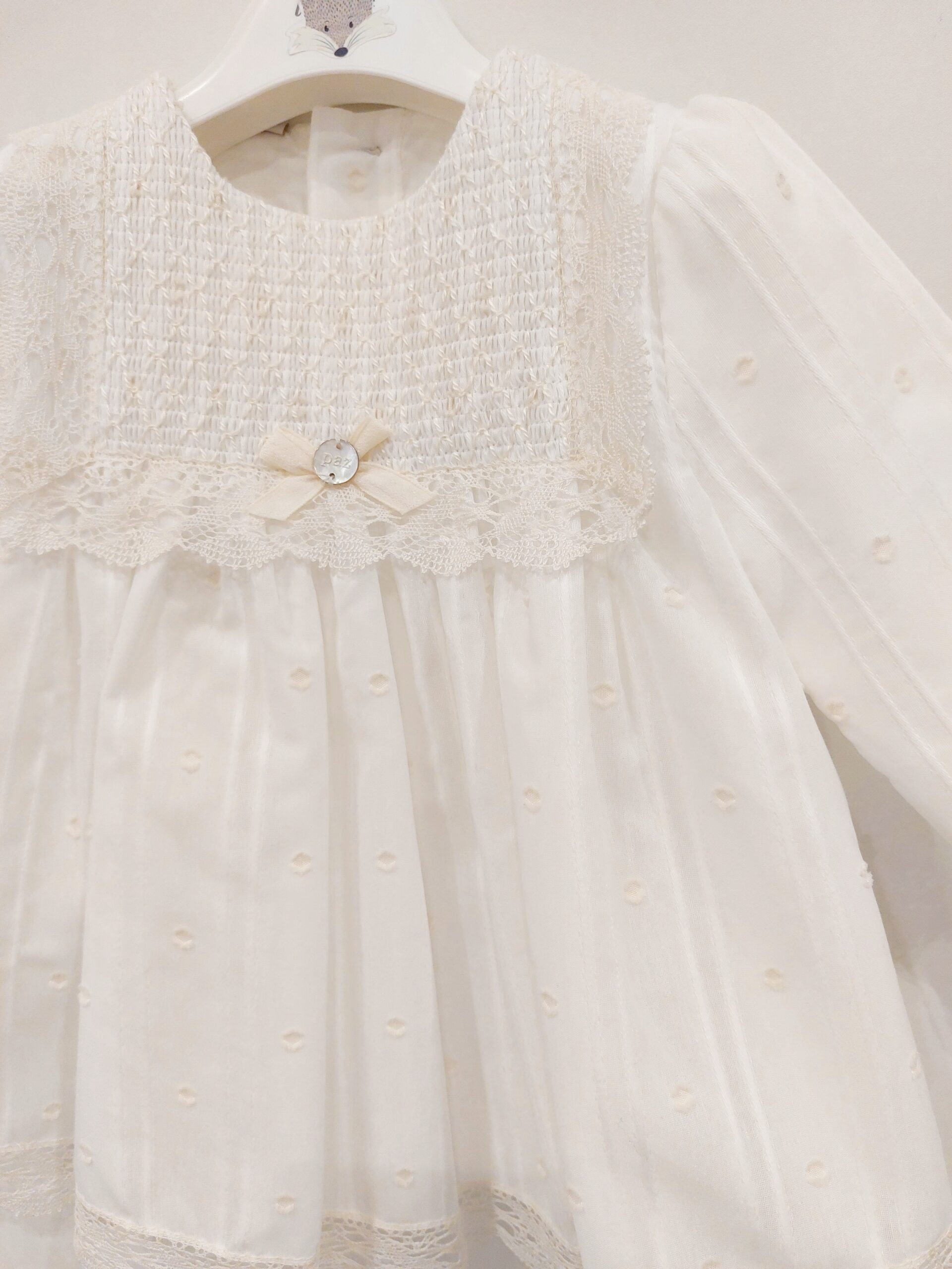 Vestito manica lunga in tessuto lavorato e corpetto bordato con inserti in pizzo di cotone e fiocchetto centrale. Con coulotte.
