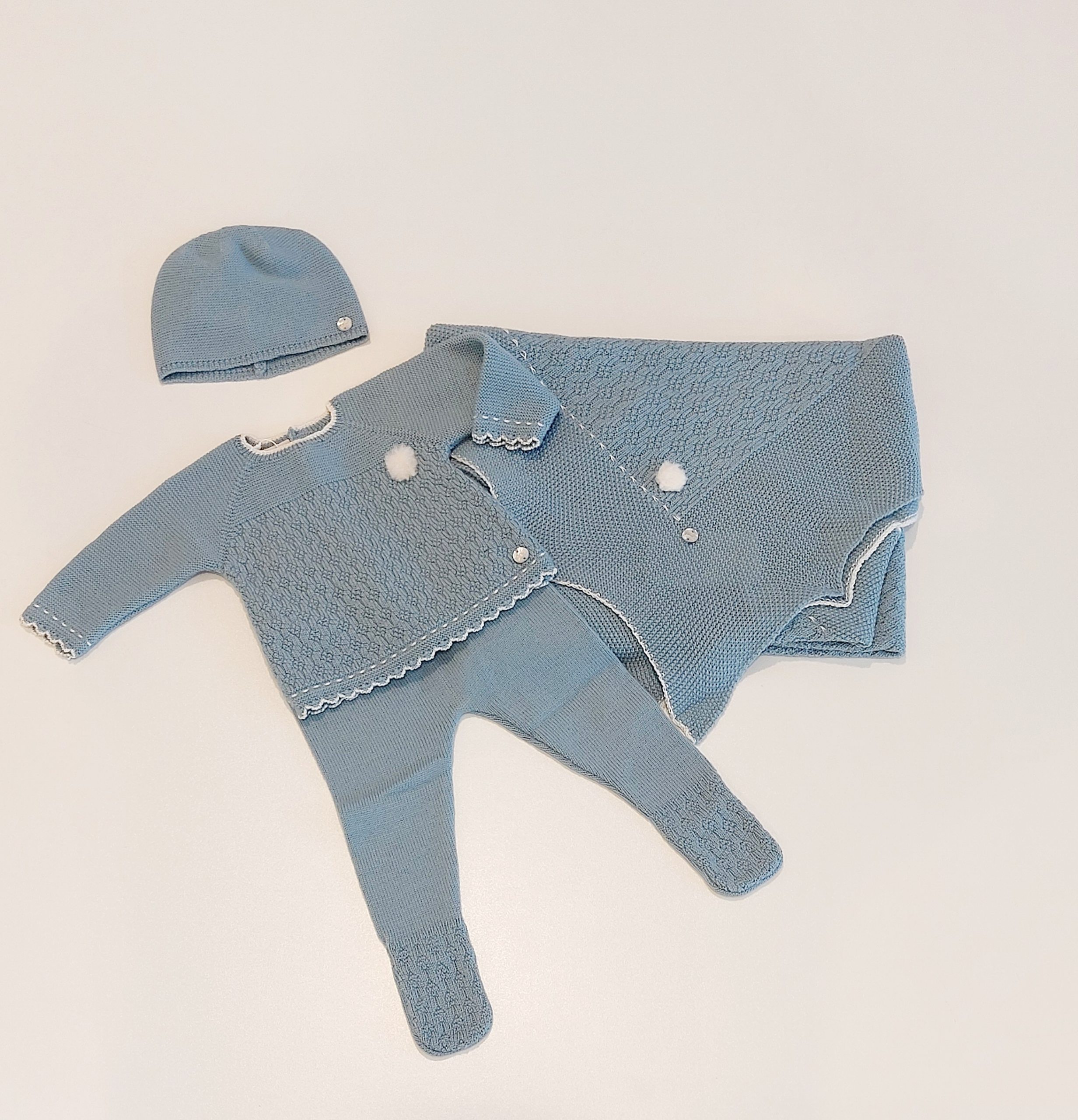 Copertina in maglia di lana con coprifasce e cuffietta abbinati con piccolo dettaglio di un ponpon bianco