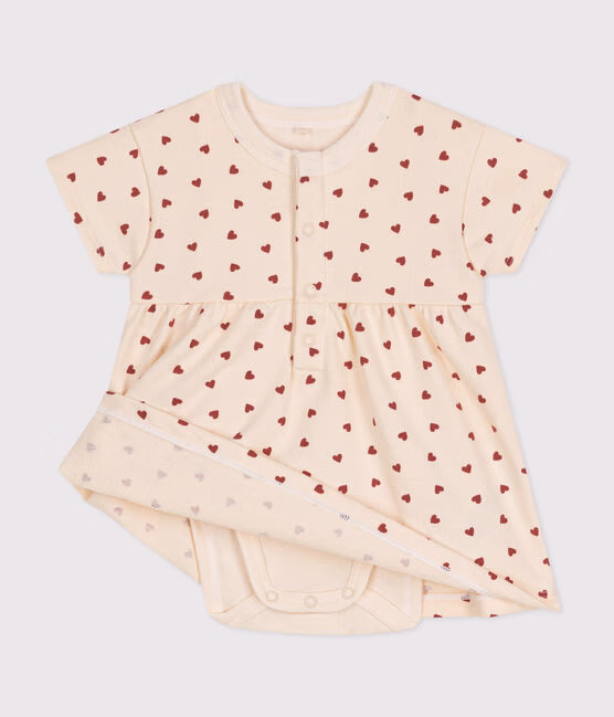 - Al vestito è cucito un body a coste tinta unita: un pratico 2-in-1 per i genitori!