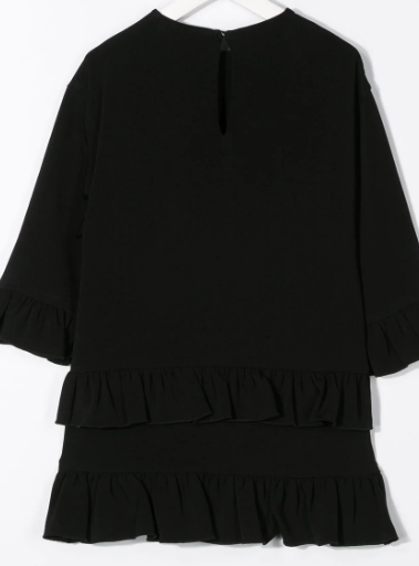 Abito modello manica 3/4 in tessuto nero con applicazione di paillettes dorate davanti. Scollatura girocollo con chiusura bottoncino dietro.