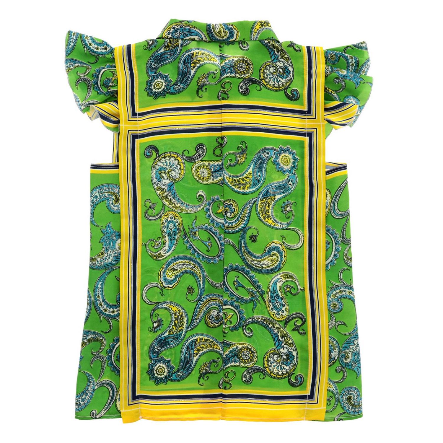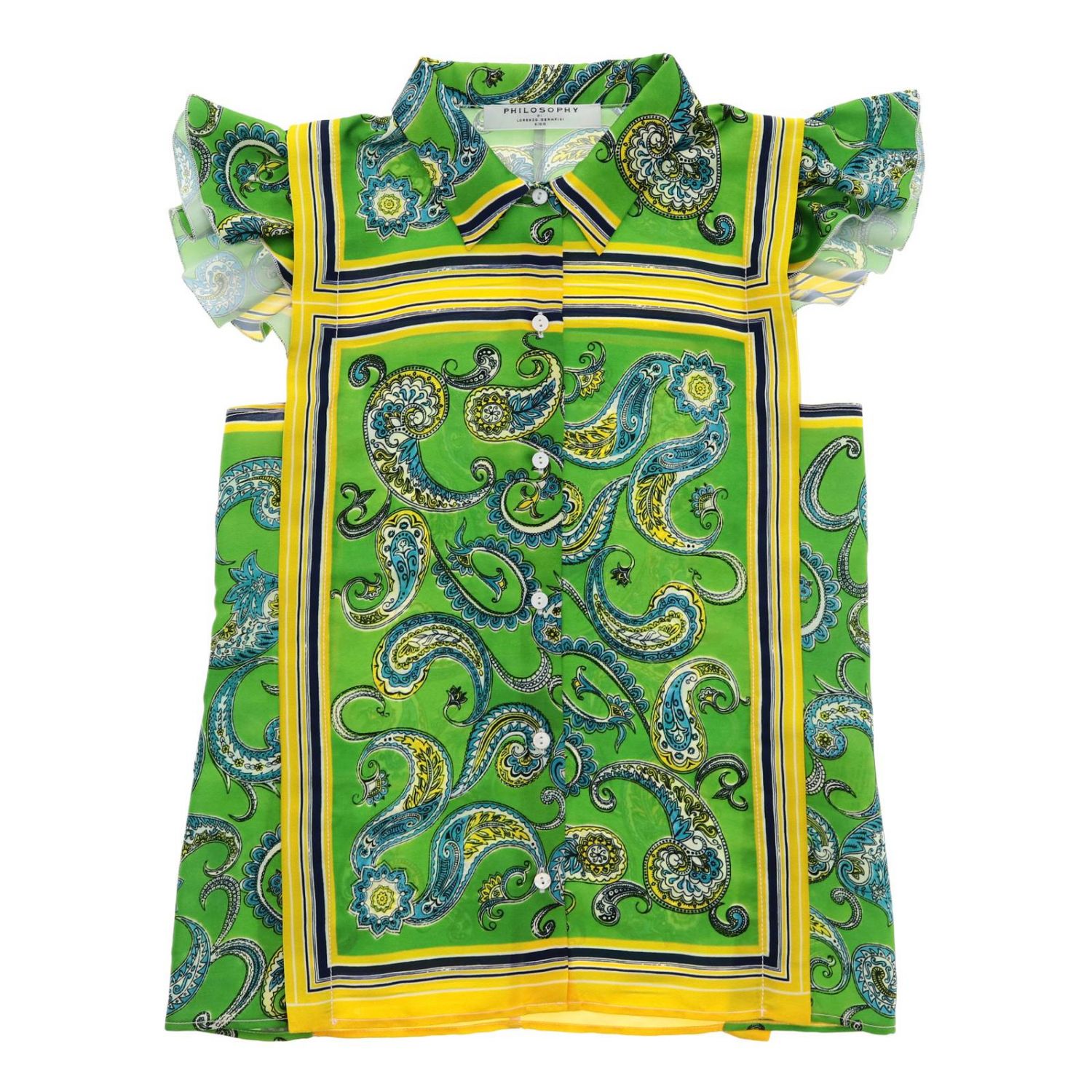 Camicia smanicata in cotone freschissimo in una esclusiva fantasia etnica che va dai toni del verde al giallo. Abbottonata davanti con colletto. Una camicia rubata dal guardaroba della mamma e rielaborata in chiave junior. Una camicia che esprime il lusso e l’eleganza del marchio Philosophy by Lorenzo Serafini.