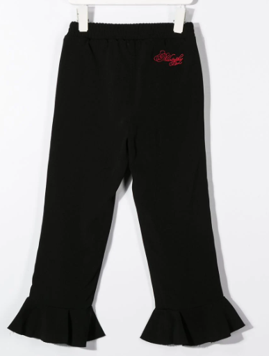 Pantalone nero lungo con elastico in vita e balza tipo ruche alle caviglie. Vestibilità asciutta e vita alta.