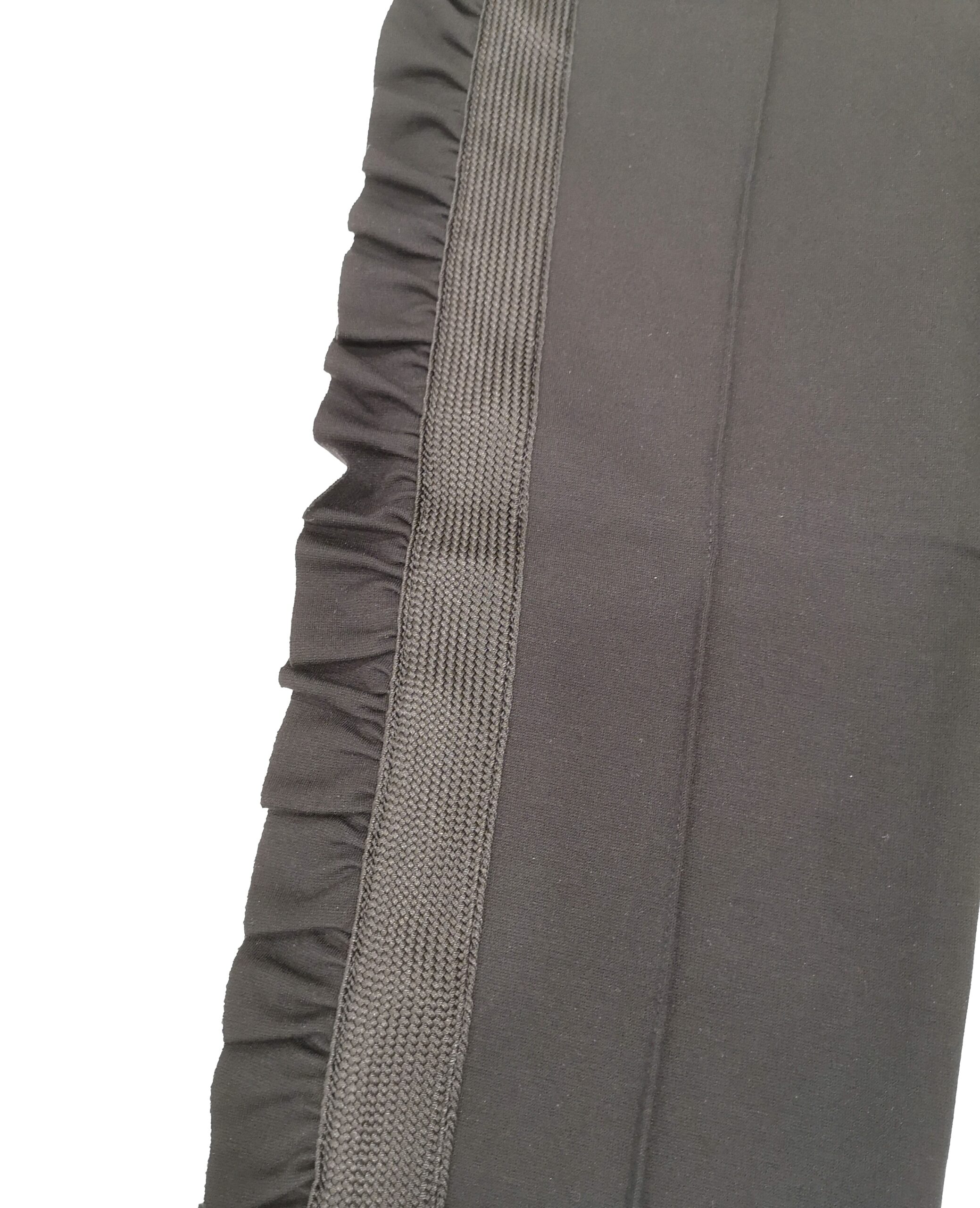 Pantalone nero in tessuto punto milano con fasce laterali con ruche