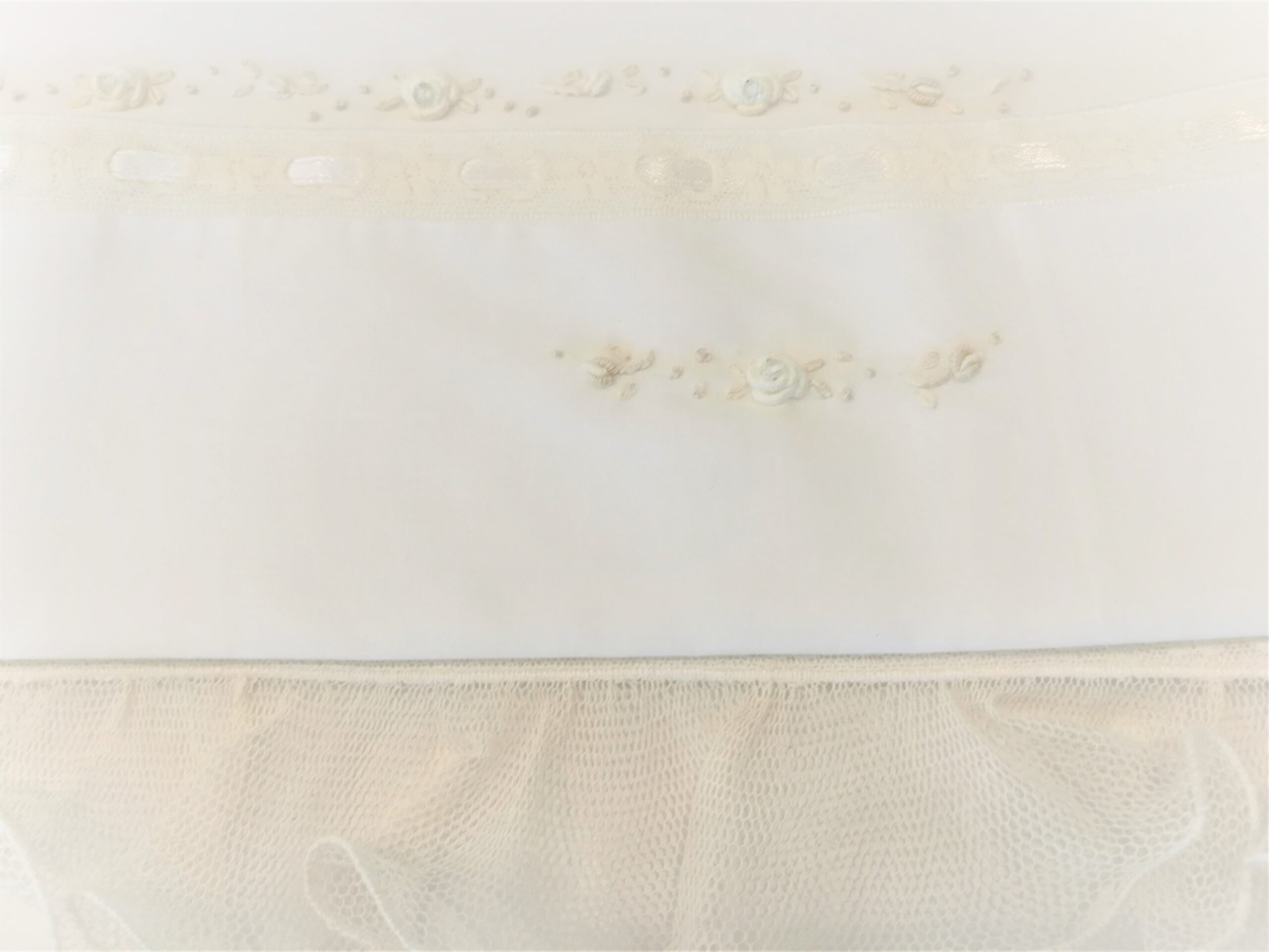 Lenzuolino panna con ricami in tinta e applicazioni in tulle e nastrino di raso.