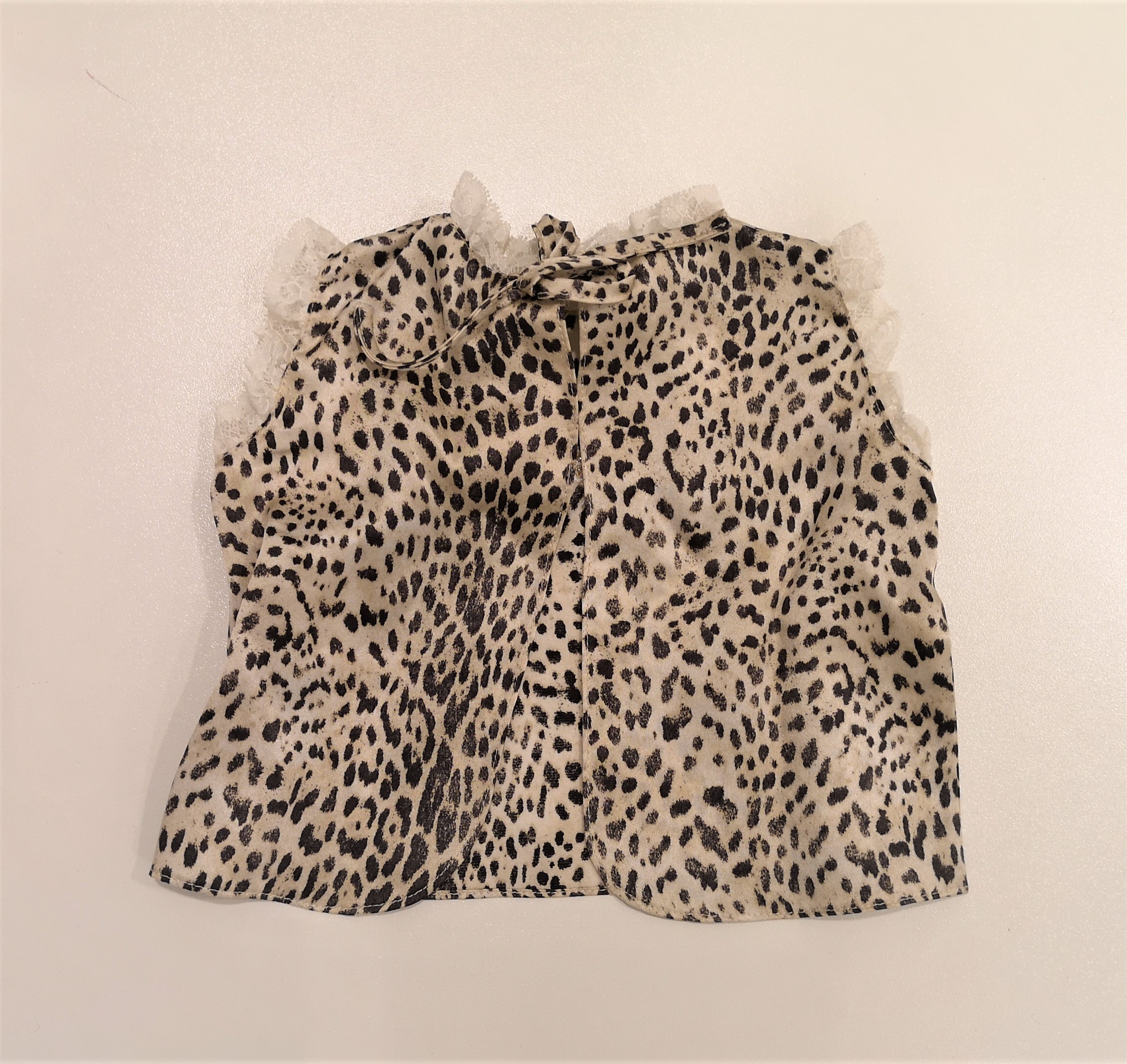 Camicina in seta per la nascita in fantasia maculata, pizzo sul girocollo e sul giromanica. Ricamo logo con cuoricino davanti.