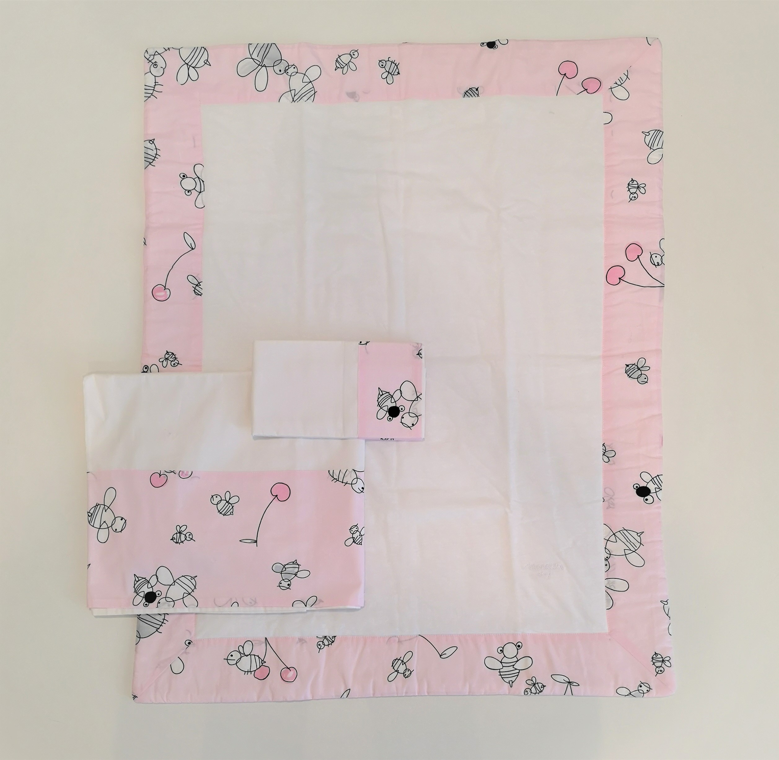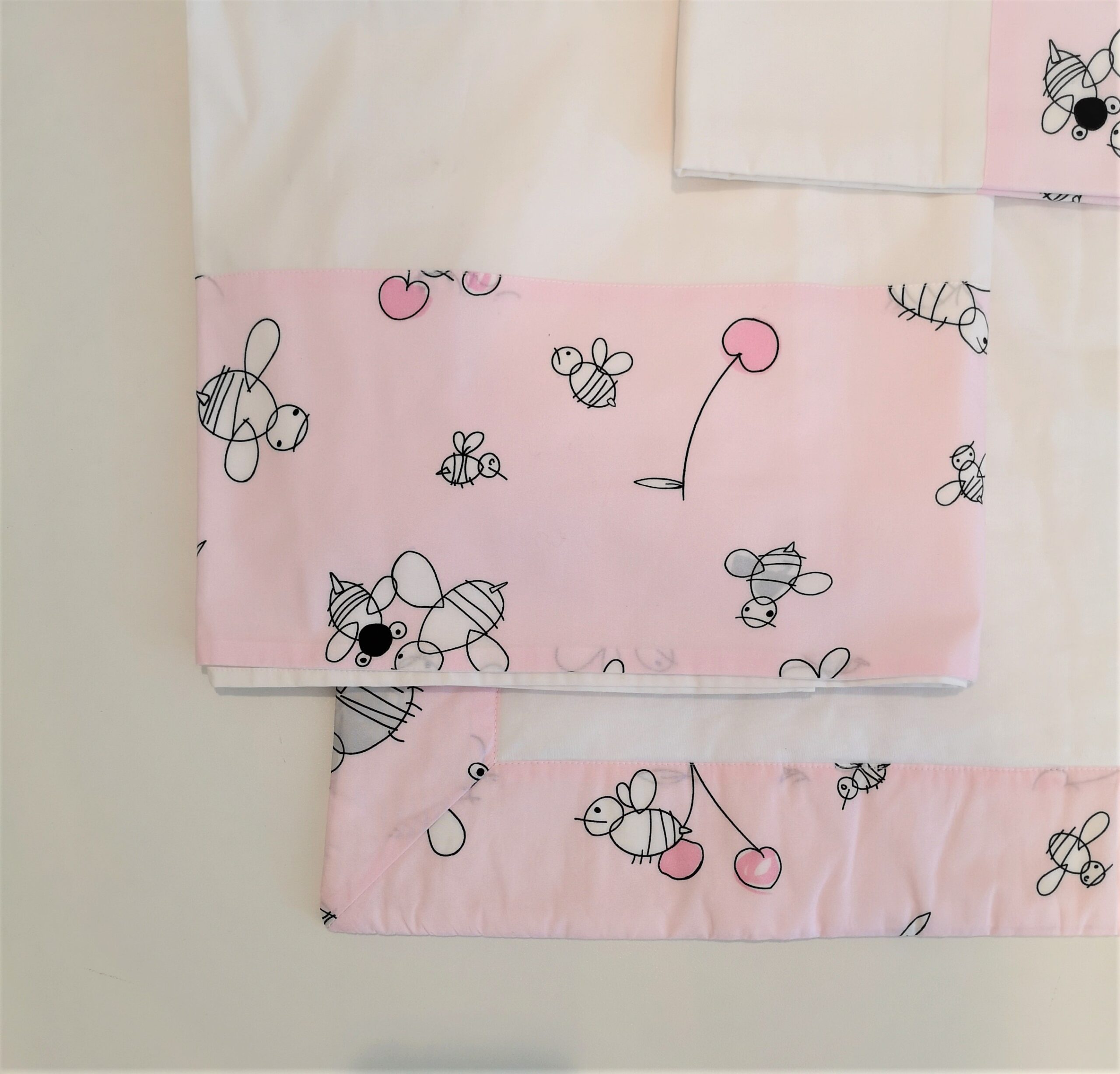 -set lenzuolino in coordinato bianco con stessa applicazione stampa api e ciliegie della copertina