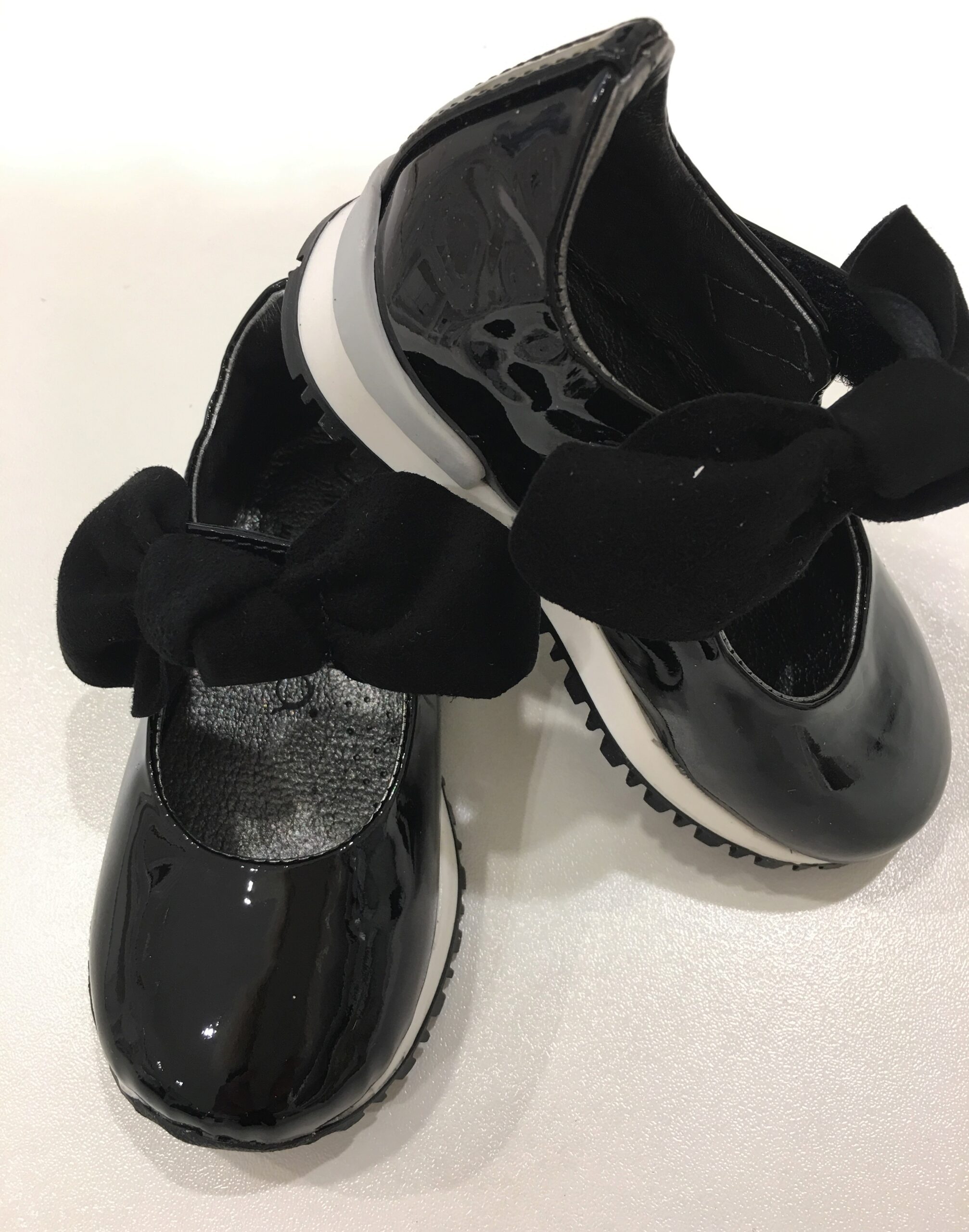 Sneakers con dettaglio fiocco di colore nero in pelle verniciata, vera pelle. Modello con punta tonda e suola piatta in gomma.