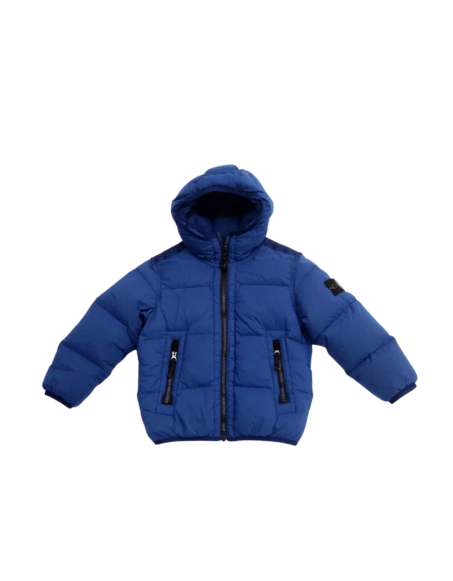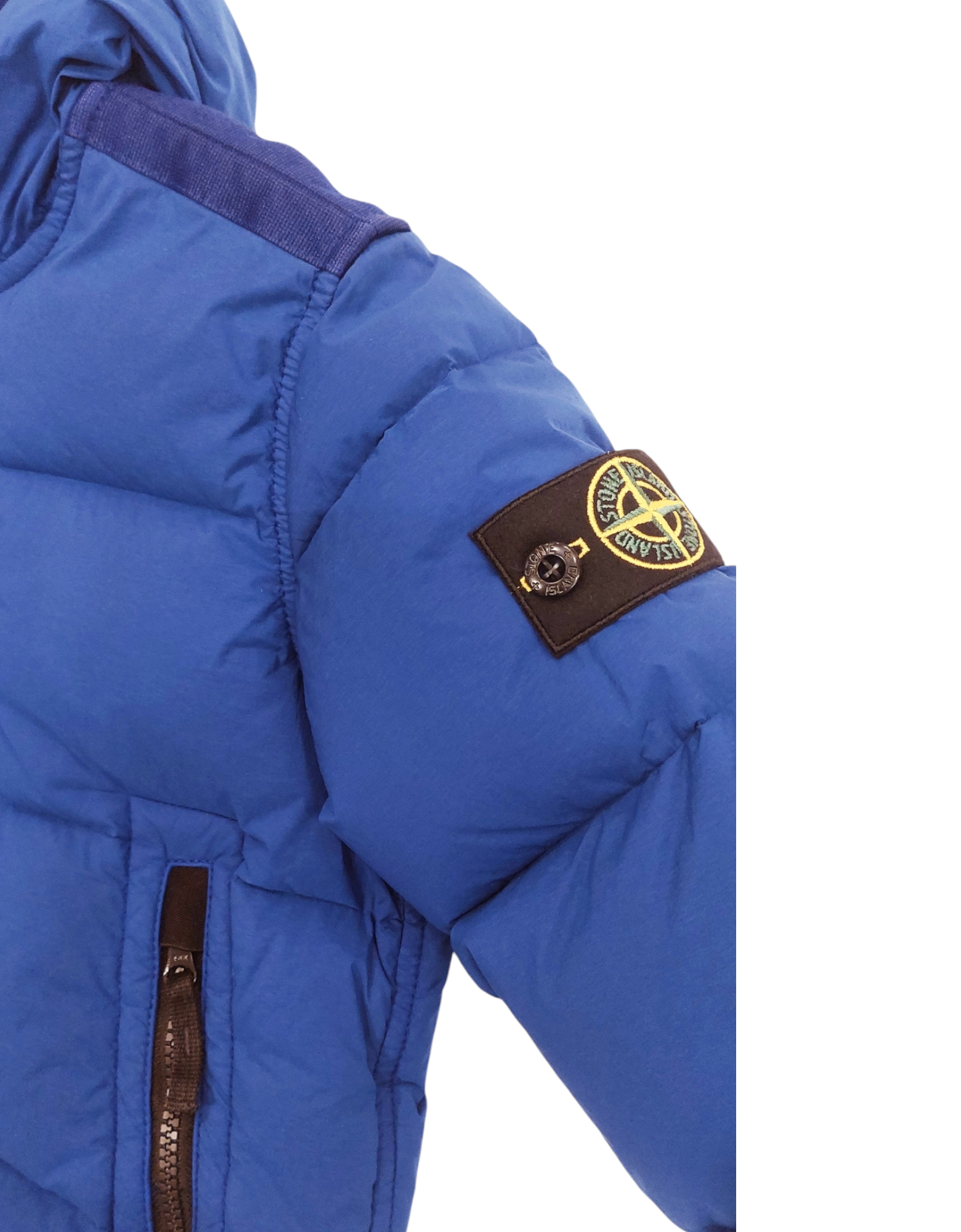 Giubbotto in nylon bluette con apertura zip in contrasto nera. Collo alto per proteggere dal vento e bordo del cappuccio rivestito con tessuto elastico tono su tono. Inserto in tessuto tono su tono sulle spalle. Tasche davanti con zip a contrasto. Etichetta con logo STONE ISLAND sulla manica sinistra.