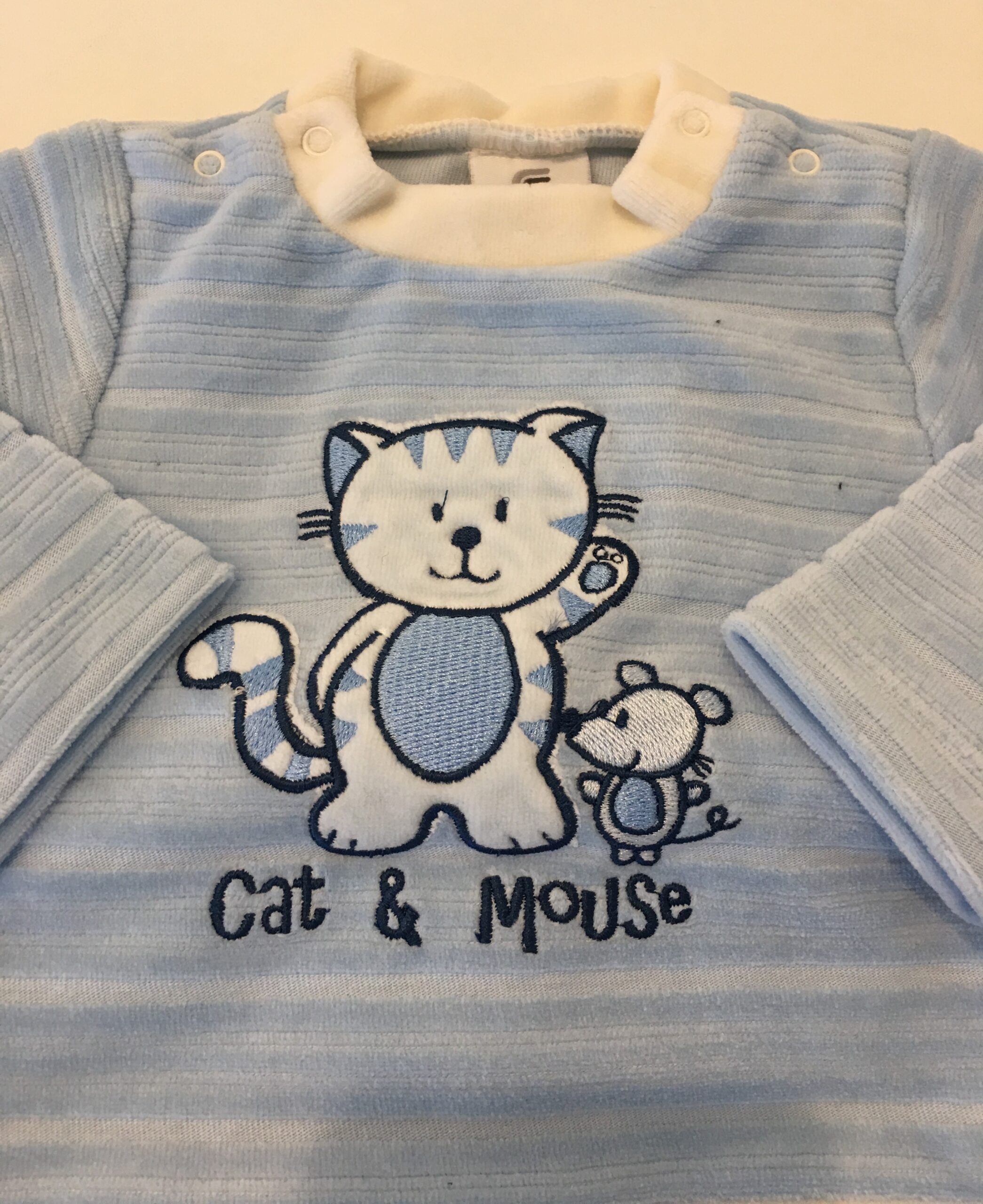 Completo nascita coprifasce in ciniglia rigata 2 pezzi: maglia girocollo con bottoncini sulle spalle, ricamo-applicazione davanti gattino + ghettina senza piedini