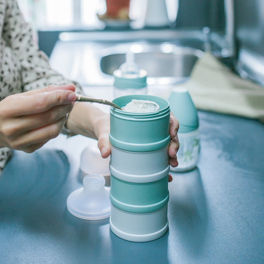 Il dosatore è formato da quattro compartimenti indipendenti, impilabili e intercambiabili, perfetti per organizzare facilmente le dosi di latte in polvere e cereali.
