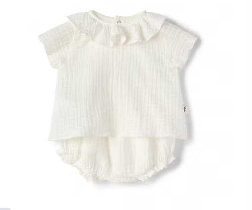 Completo due pezzi in garza doppia 100% cotone dall’effetto goffrato di colore bianco latte composto da maglia a maniche corte con colletto pierrot e culotte con elastico in vita.
