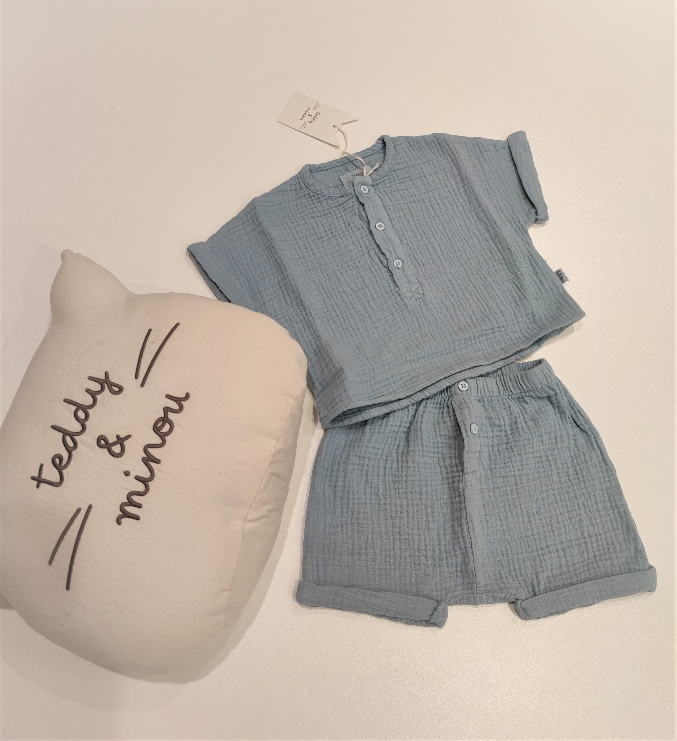 Completo due pezzi in garza doppia 100% cotone dall’effetto goffrato di colore azzurro composto da maglia a maniche corte girocollo modello serafino con bottoncini e culotte con elastico in vita.