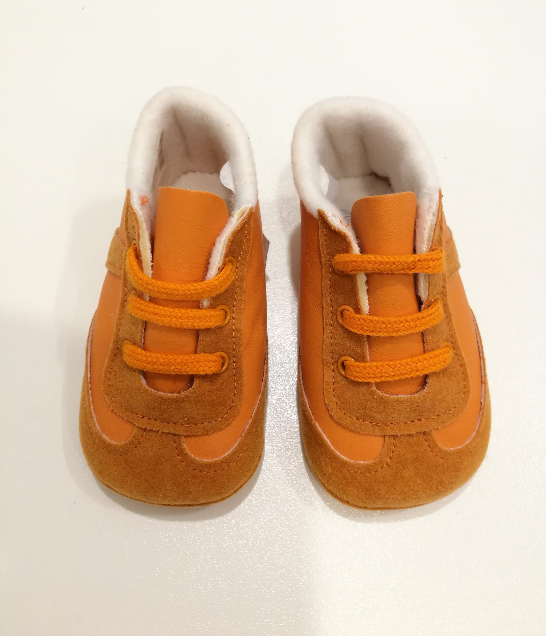 Scarpette in tessuto arancio con riporti in suède. Allacciate