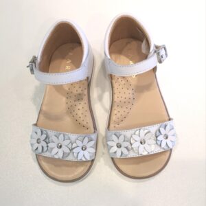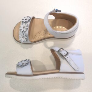 Sandali in pelle bianca con fiorellini bianco-argento. Chiusura con fibietta