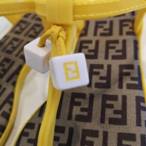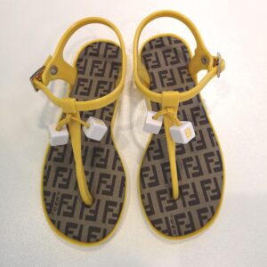 Sandali infradito in gomma gialla. Suola interna in materiale istituzionale FENDI con logo. Ciodolini a forma di cubetti bianchi logati
